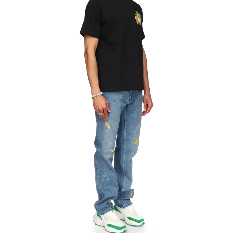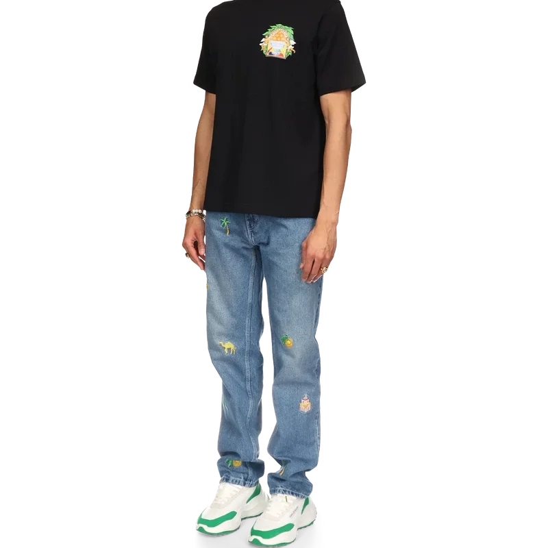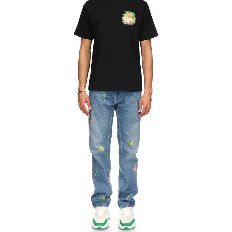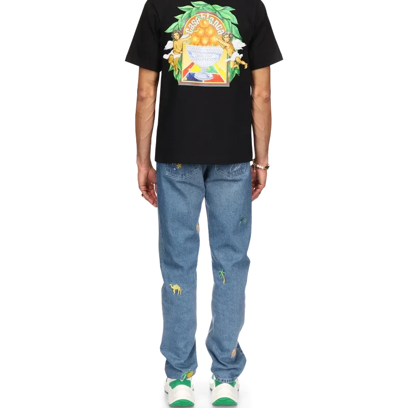Tricoul Triomphe D’orange prezintă un imprimeu cu opera de artă semnătură a casei, care încorporează tenisul și piramida noastră portocalie, repetată într-un imprimeu mai mare pe spate. Confecționat din jersey negru și completat cu un guler rotund clasic și etichetă cu marca Casablanca.