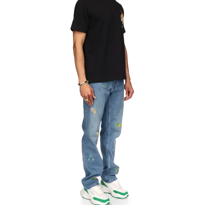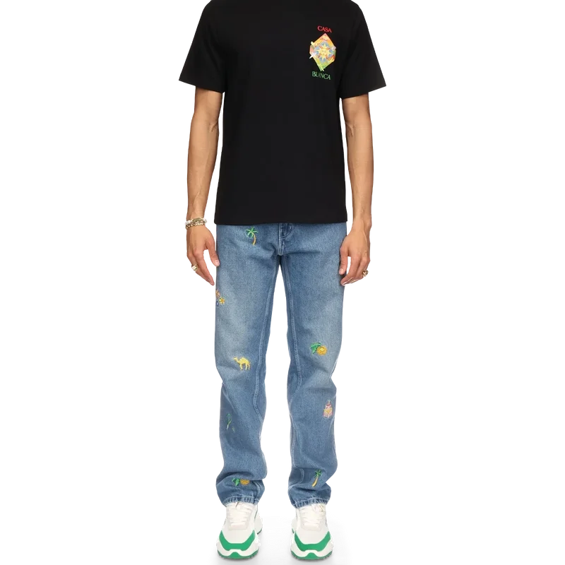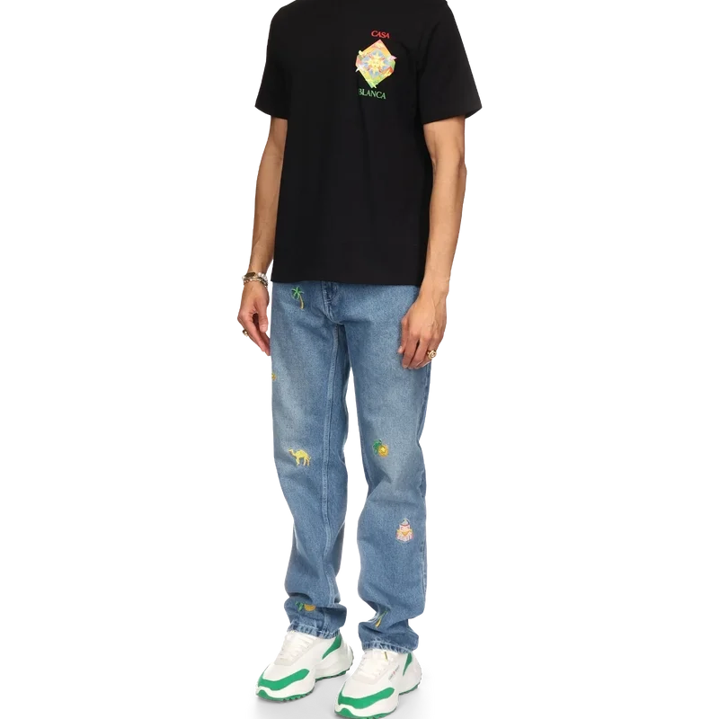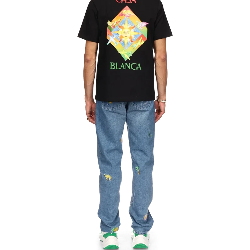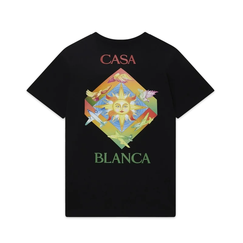 Tricoul Les Elements din bumbac organic, cu imprimeu serigrafic, prezintă un design sezonier care încorporează simbolistica Casablanca și iconografia arabă, cu porumbei ai păcii. Completat cu guler rotund clasic, mâneci scurte și etichetă cu marca Casablanca Paris, conceput pentru o croială lejeră.