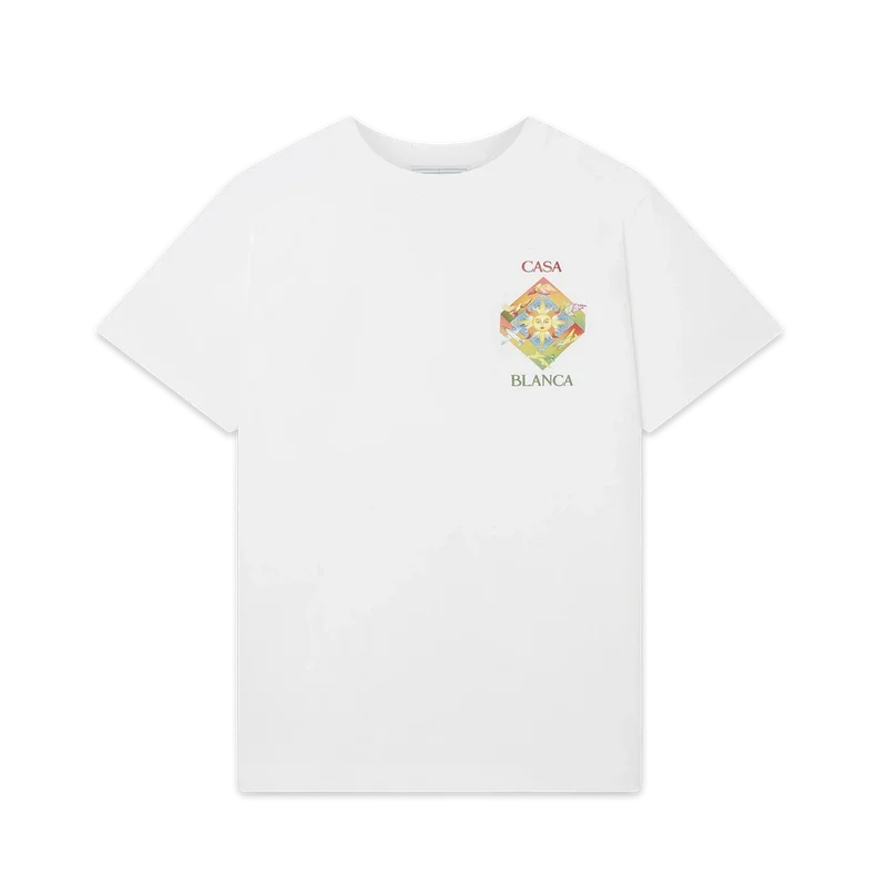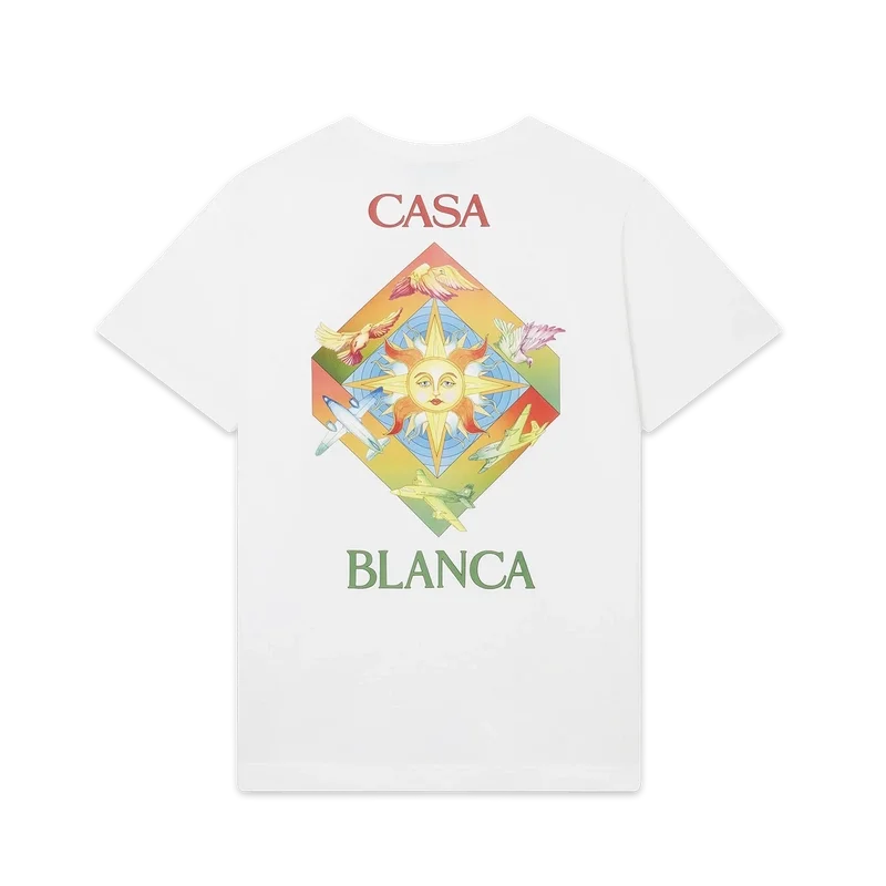 Tricou din bumbac organic cu imprimeu serigrafic Les Elements prezintă un design sezonier care încorporează simbolistica Casablanca și iconografia arabă, cu porumbei ai păcii. Completat cu guler rotund clasic, mâneci scurte și etichetă cu marca Casablanca Paris, conceput pentru o croială lejeră.