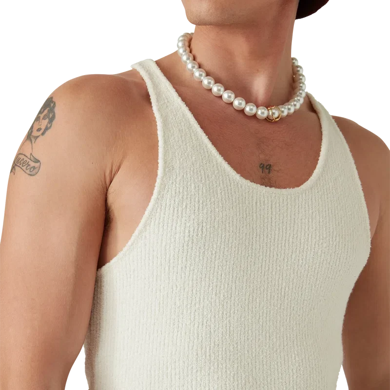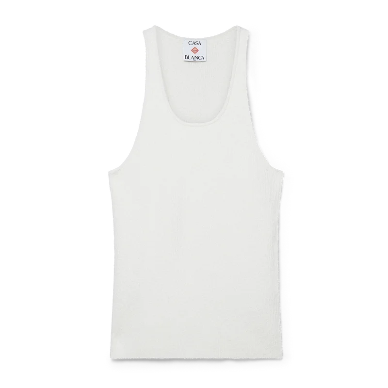 Vesta cu nervuri Boucle este un model fără mâneci, cu textură, confecționat dintr-un material din amestec de bumbac Boucle. Completată cu guler rotund și spate în formă de U, cu logo-ul diamant caracteristic casei.