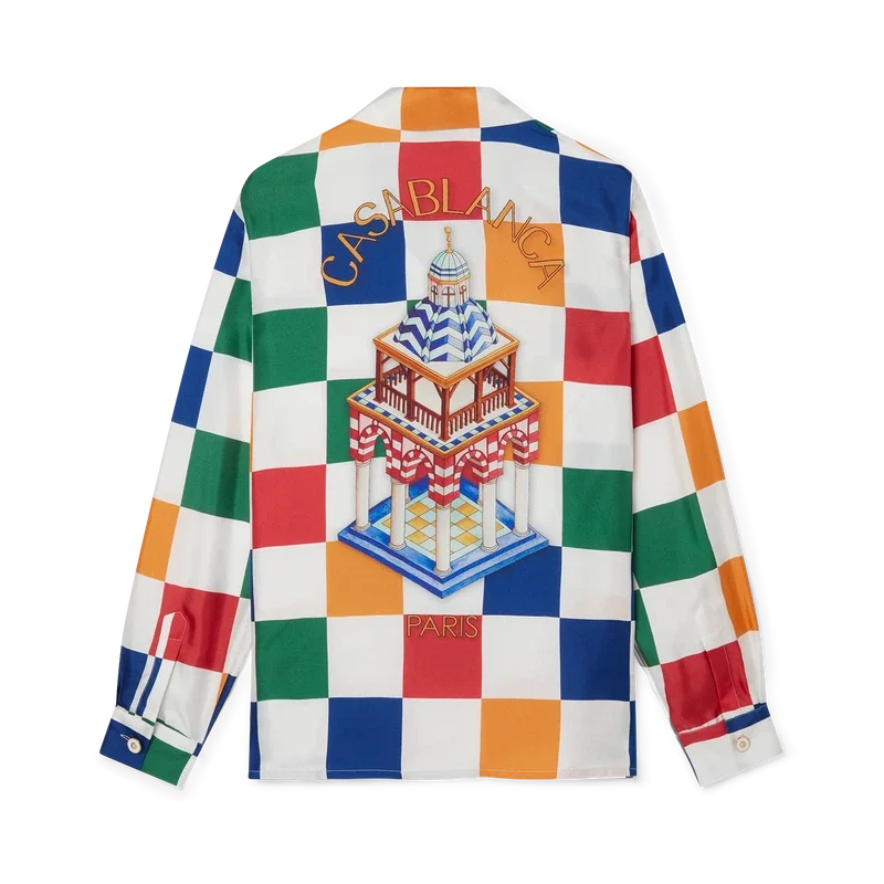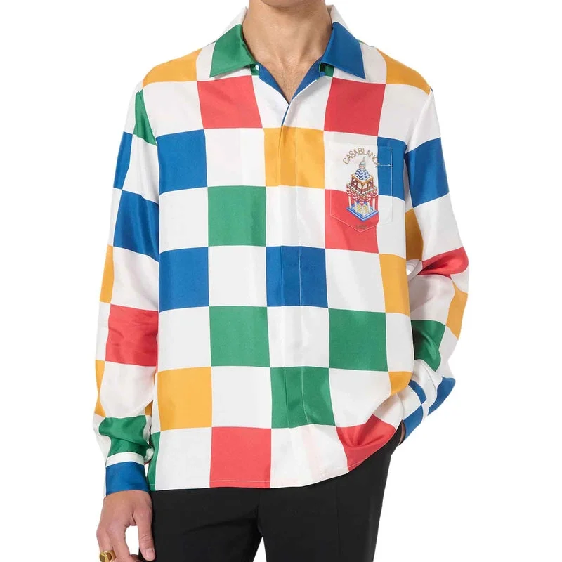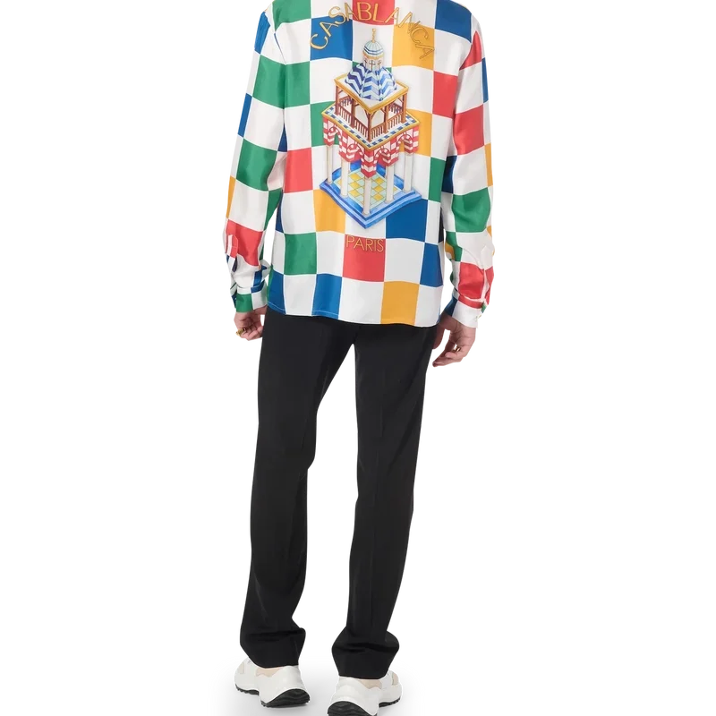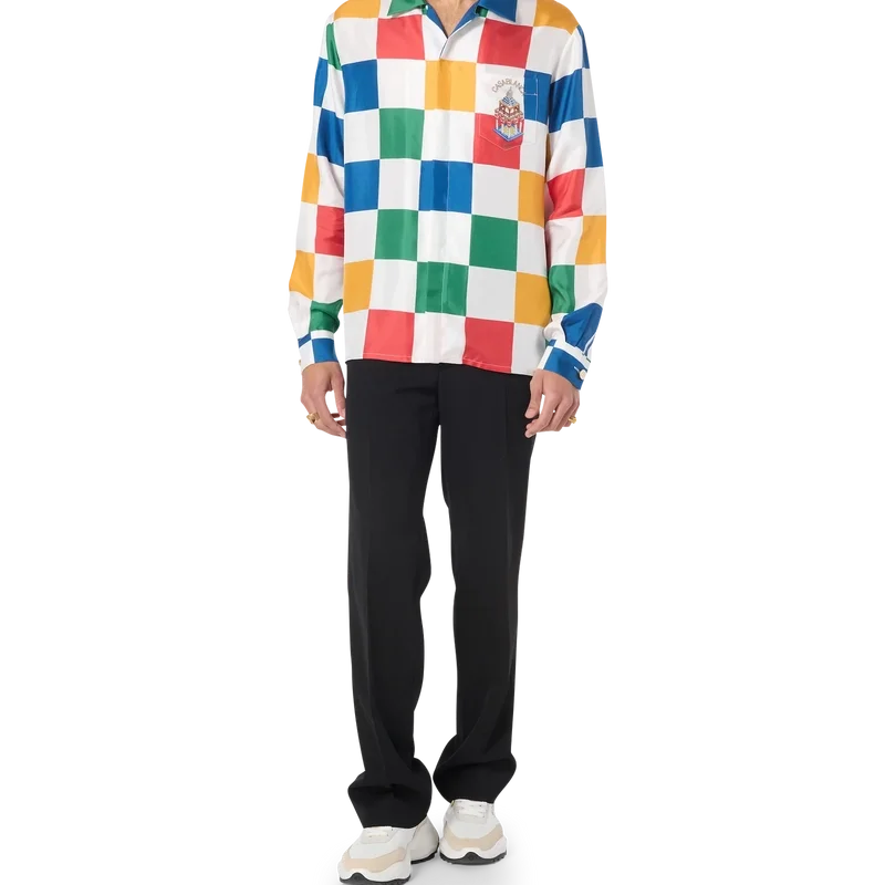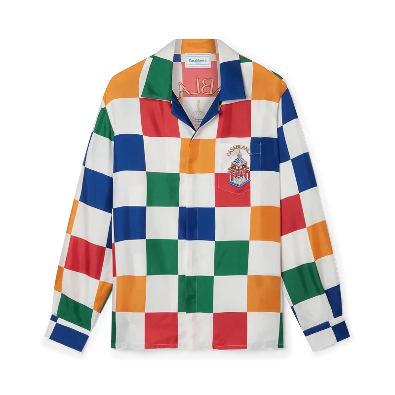 Cămașa din mătase cu carouri Casablanca Primary este un model cu mâneci lungi, imprimat cu un design în carouri pe toată suprafața – o referință la jocurile de masă arabe. Completată cu un motiv sezonier pe spate și pe buzunarul de la piept. Finisată cu un guler destinat a fi purtat deschis și o închidere cu nasturi în față.