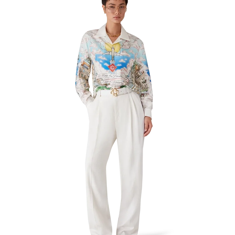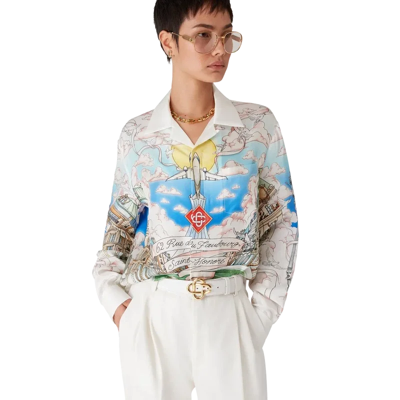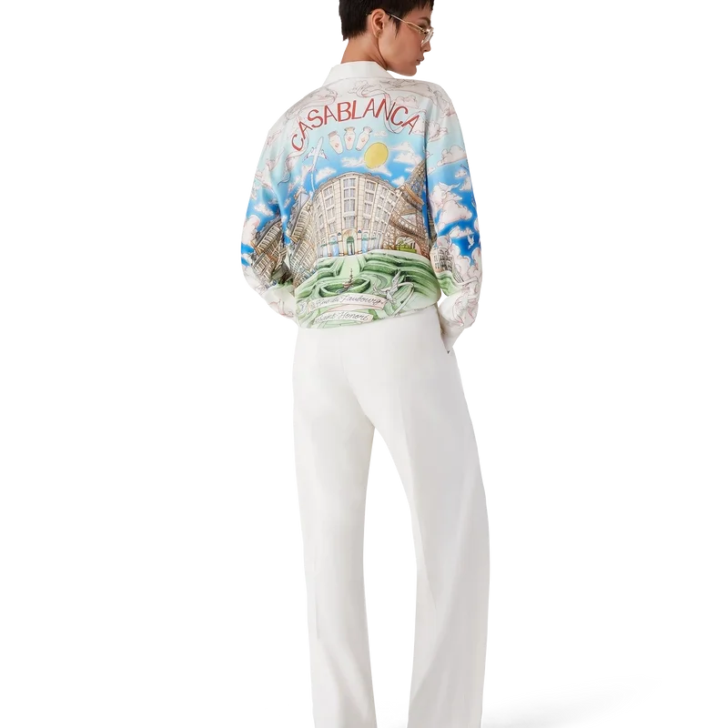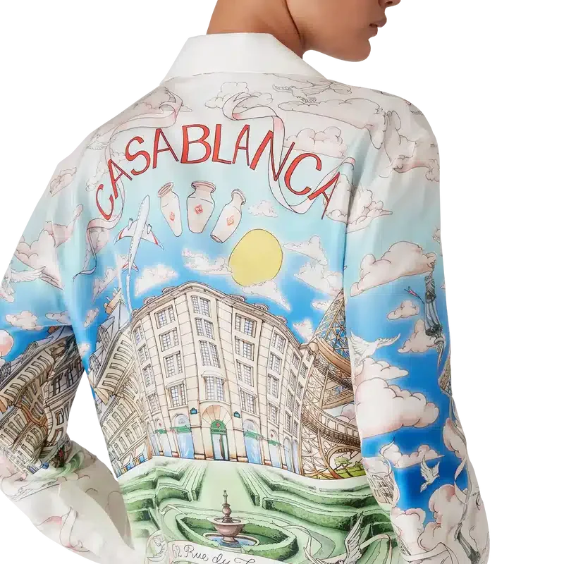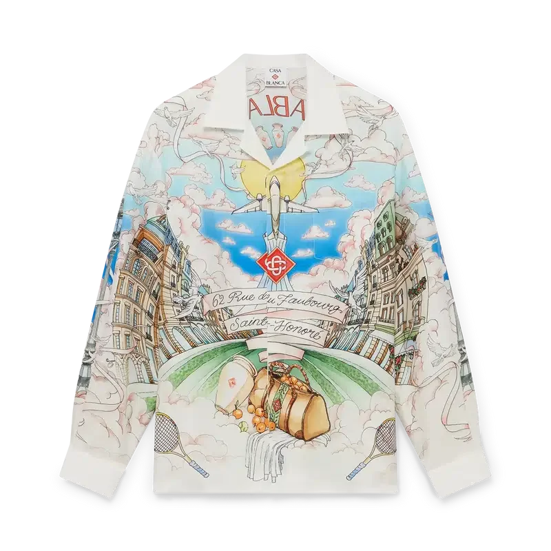 Cămașa din mătase cu mâneci lungi La Vie Parisienne este un model cu imprimeu integral, conceput exclusiv pentru magazinul nostru principal, cu motive inspirate de arhitectură, tenis, natură și călătorii, reprezentând magazinul nostru din Paris, situat pe Rue Du Faubourg Saint-Honora, una dintre cele mai istorice străzi din lume pentru modă și design și un simbol al eleganței și rafinamentului francez. Completată cu guler cubanez, închidere cu nasturi, nasturi din corozo cu logo-ul Cc intercalat și nasturi emailati cu margine aurie la manșete. Această piesă este disponibilă exclusiv pe Casablancaparis.Com și în magazinul nostru din Paris.