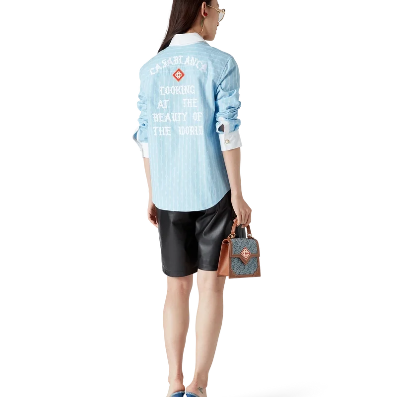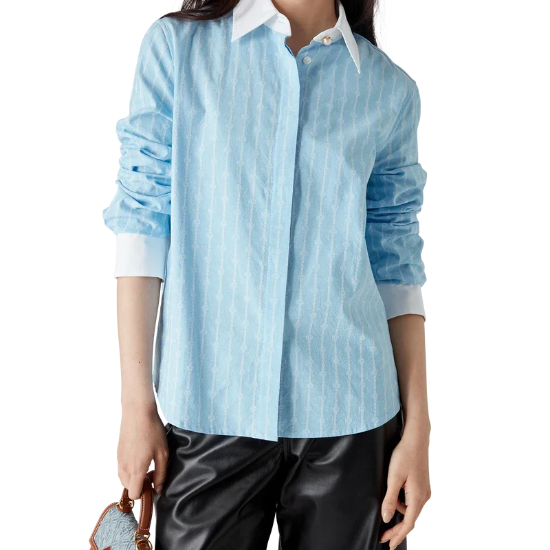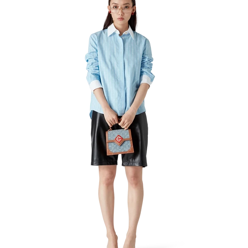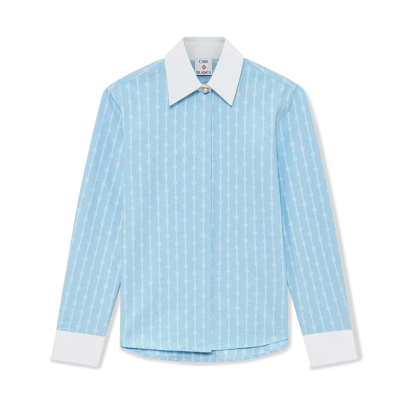 Cămașa cu mâneci lungi Laurel cu dungi subțiri are un design croit, fiind confecționată din țesătură de bumbac jacquard. Este completată de manșete albe contrastante și guler ascuțit, închidere ascunsă cu nasturi din corozo cu logo Cc intercalat și tiv curbat.