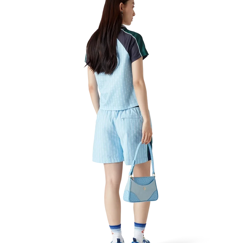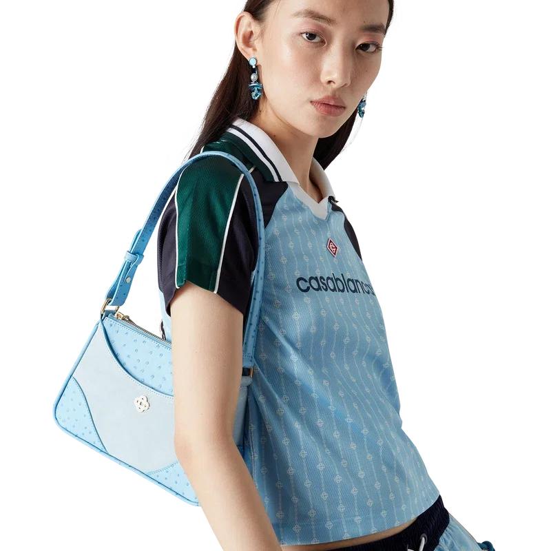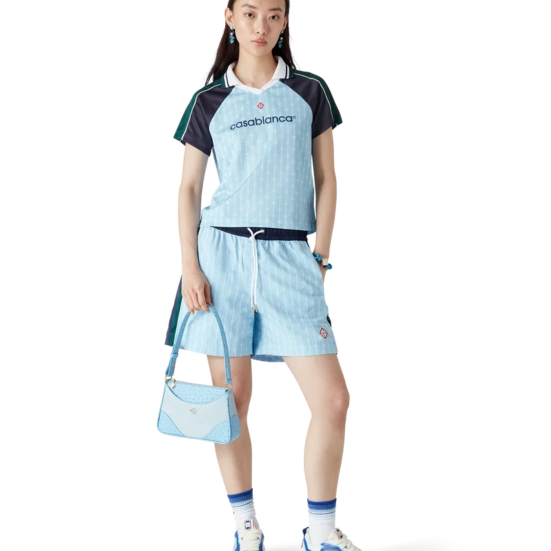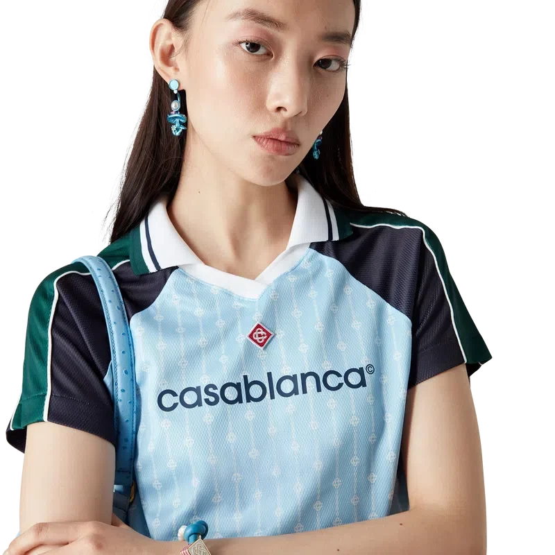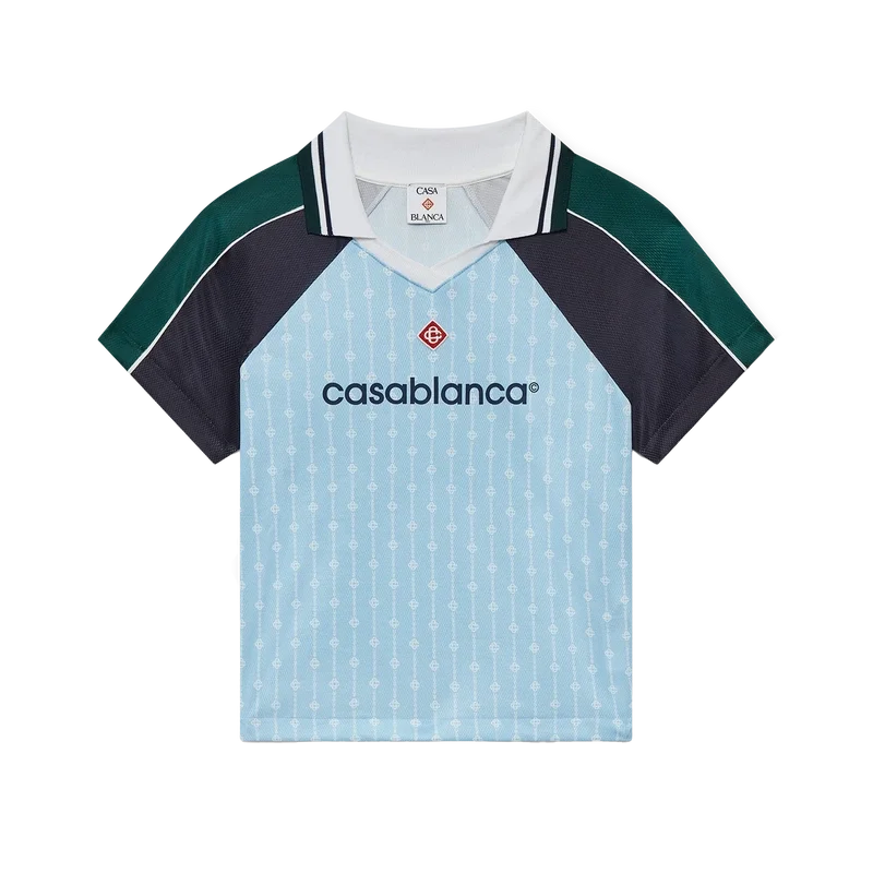 Cămășa de fotbal Pinstripe Laurel este un articol sportiv cu mâneci scurte, confecționat dintr-un material tip plasă Birdseye, care prezintă logo-ul interconectat „Cc” caracteristic mărcii. Este completat cu inserții negre și verzi pe umeri și mâneci, logo-ul caracteristic în formă de romb, logo-ul Casablanca, borduri albe, guler în V cu nervuri și guler cu detalii de margine în dungi negre, albe și verzi.