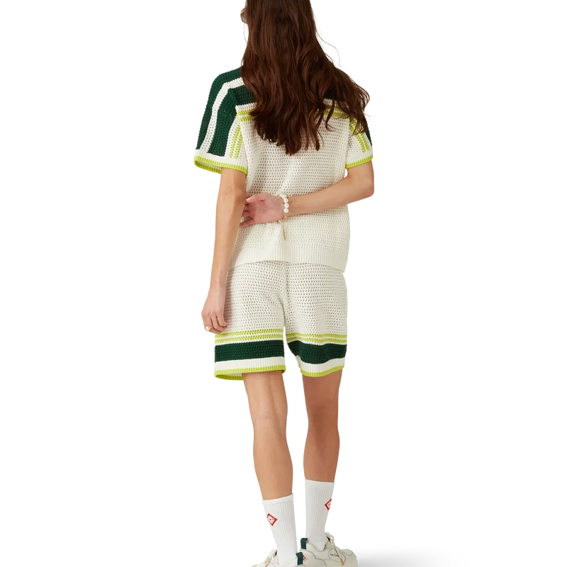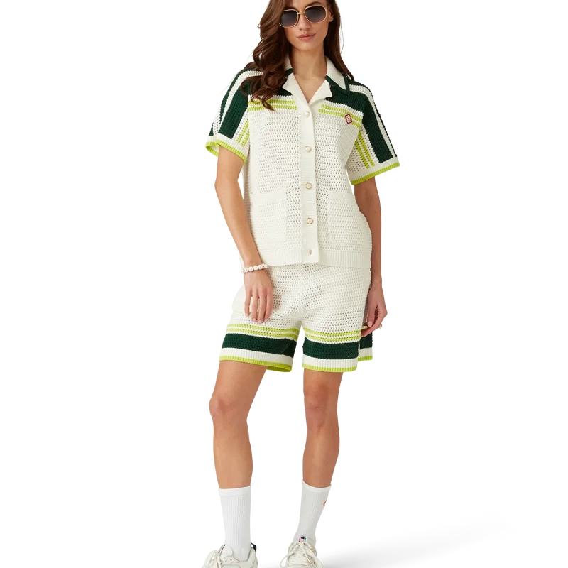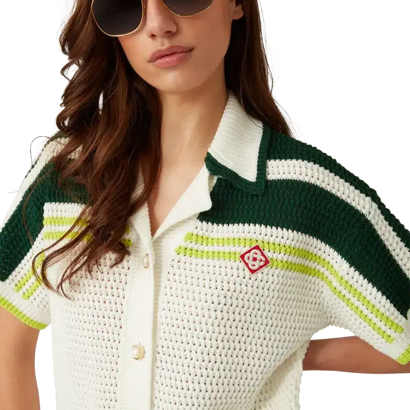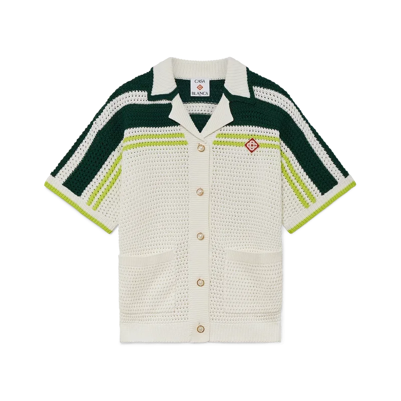 Cămașa de tenis Crochet este un model tricotat cu mâneci scurte, confecționat din țesătură de bumbac cu efect de croșetat și prezintă logo-ul diamant caracteristic al casei. Completată cu nasturi cu margini aurii și perle, detalii cu dungi pe umeri și pe mâneci, buzunare aplicate în față și detalii cu margini în dungi la guler și manșete.