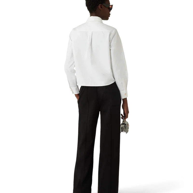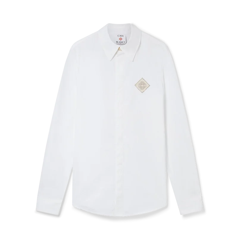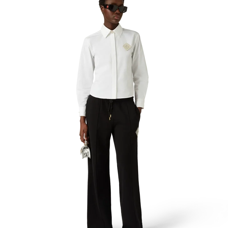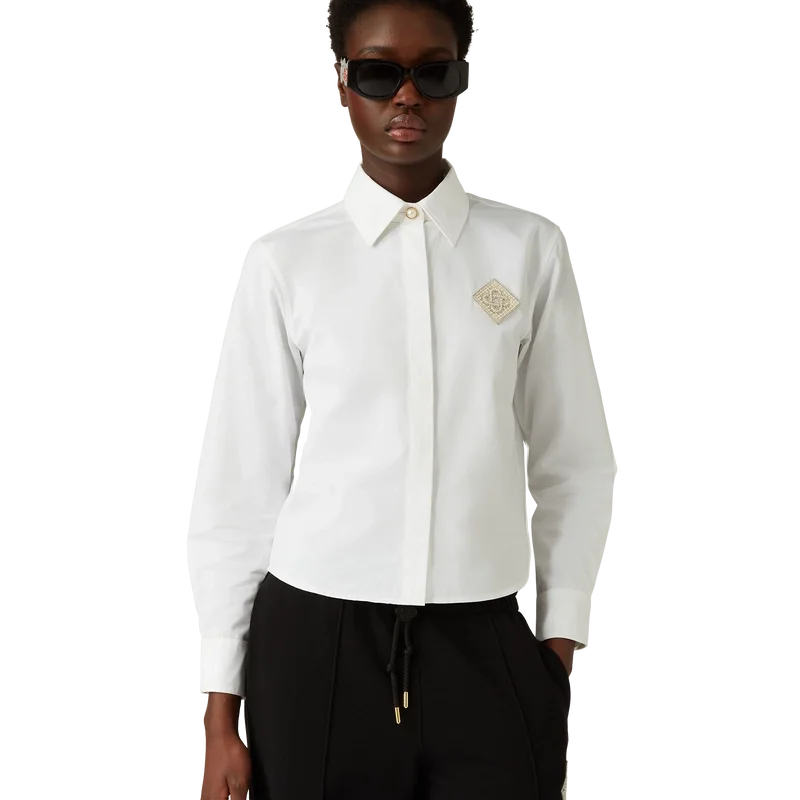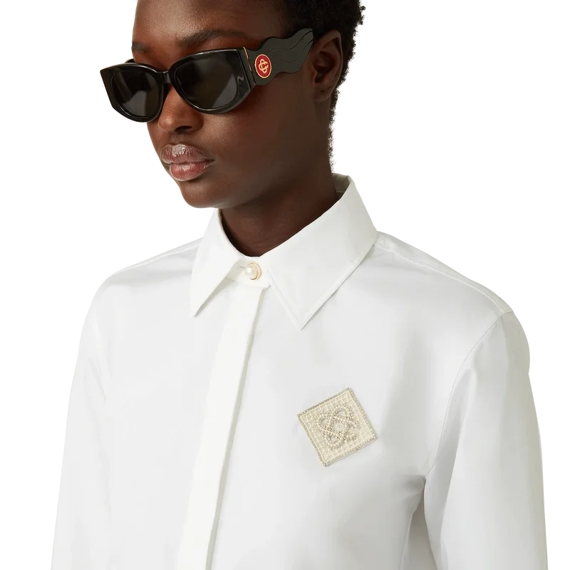 Cămașa din bumbac cu patch-uri Pearl Diamond este un model cu mâneci lungi, confecționat din țesătură de bumbac, cu logo-ul diamant caracteristic casei, reinterpretat pentru acest sezon. Completată cu un guler clasic în V, nasturi cu margini aurii caracteristice la guler și la manșete și închidere cu nasturi ascunși.