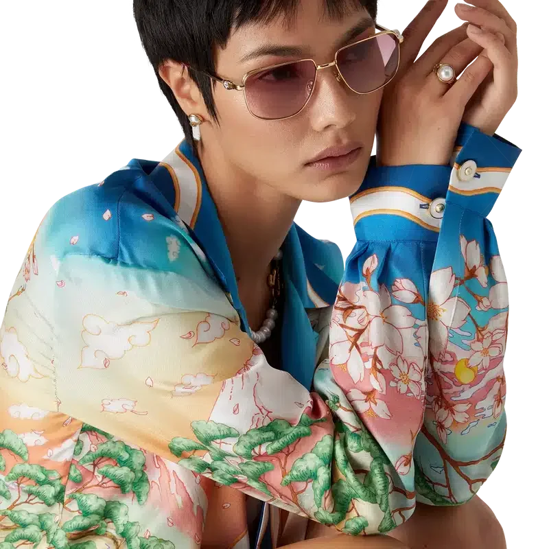 Completată cu închidere cu nasturi, nasturi din corozo cu logo-ul Cc intercalat, nasturi cu margine aurie și perle la guler și manșete, precum și detalii cu dungi inspirate de valurile Memphis pe tiv, manșete, placket și guler.