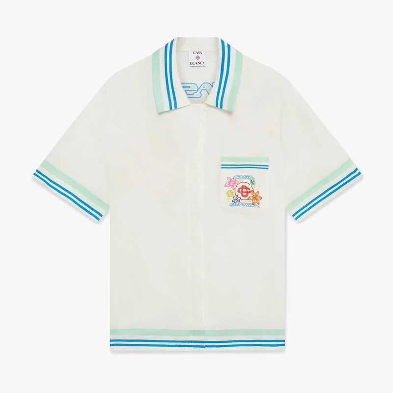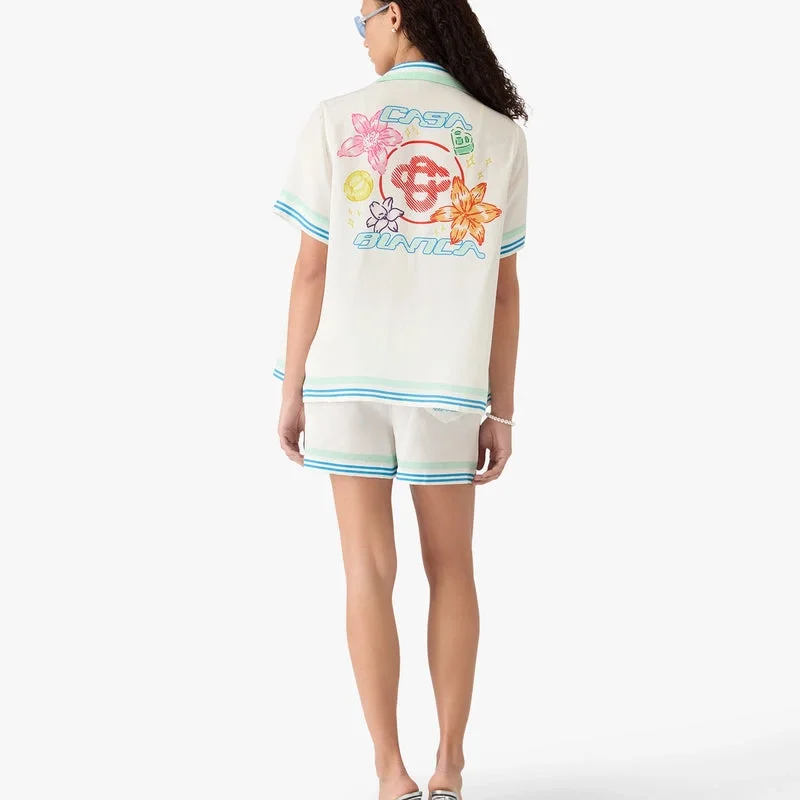 Cămășa din mătase cu mâneci scurte și guler cubanez cu imprimeu floral este un model imprimat care prezintă colajul grafic al sezonului, cu interpretări ale logo-ului, feței zâmbitoare și florii de orhidee. Completată cu guler cubanez, închidere cu nasturi, nasturi din corozo cu logo-ul Cc intercalat, un buzunar la piept și detalii cu dungi verzi, albastre și albe pe guler, manșete, tiv și buzunar, într-o siluetă relaxată.
