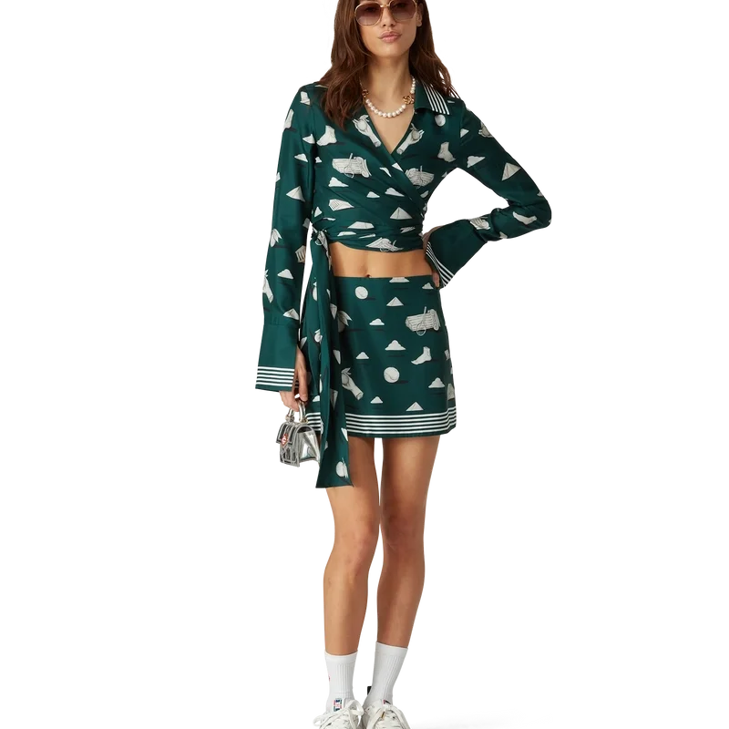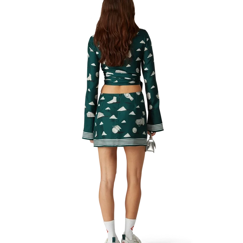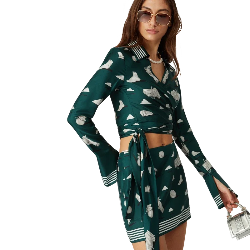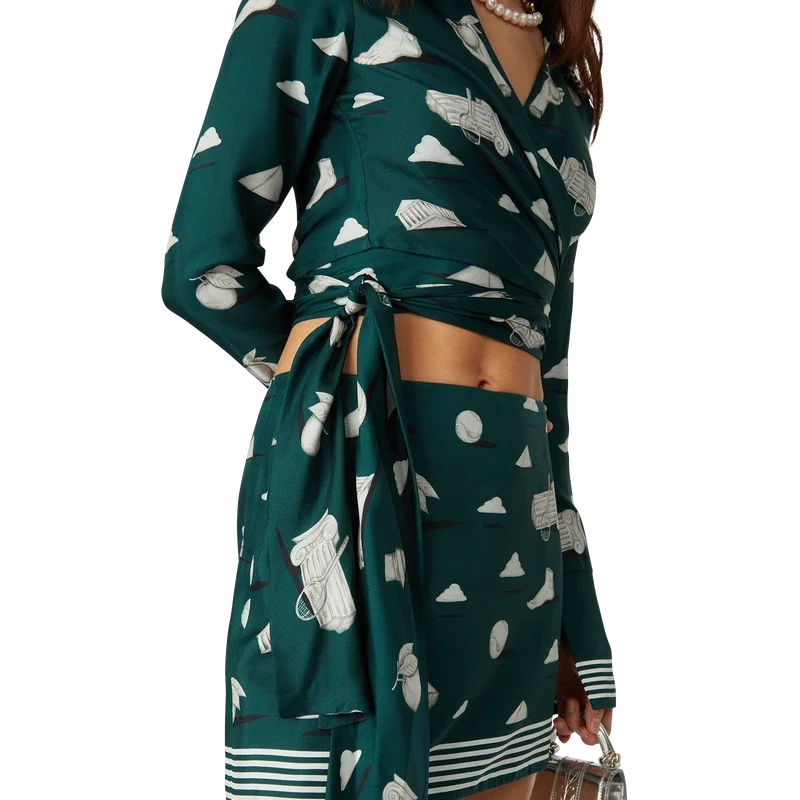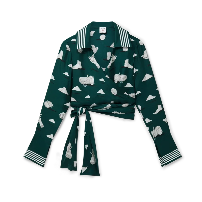 Cămașa din mătase Metaphysical este un model cu mâneci lungi și imprimeu pe toată suprafața, confecționată din țesătură de mătase twill, cu un imprimeu repetitiv Trompe L’oeil cu efect de piatră și elemente de design conturate ușor. Completată cu guler în V și mâneci evazate cu fante și detalii cu margini în dungi, precum și o închidere înfășurată.
