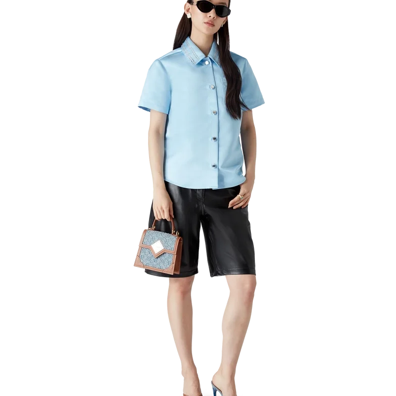 Cămașa din satin cu mâneci scurte are un design clasic și este confecționată din țesătură de satin. Prezintă închidere cu nasturi, nasturi placati cu aur cu sigla mărcii, guler ascuțit, tiv curbat, buzunar la piept și detalii cu mărgele pe guler și buzunarul de la piept.