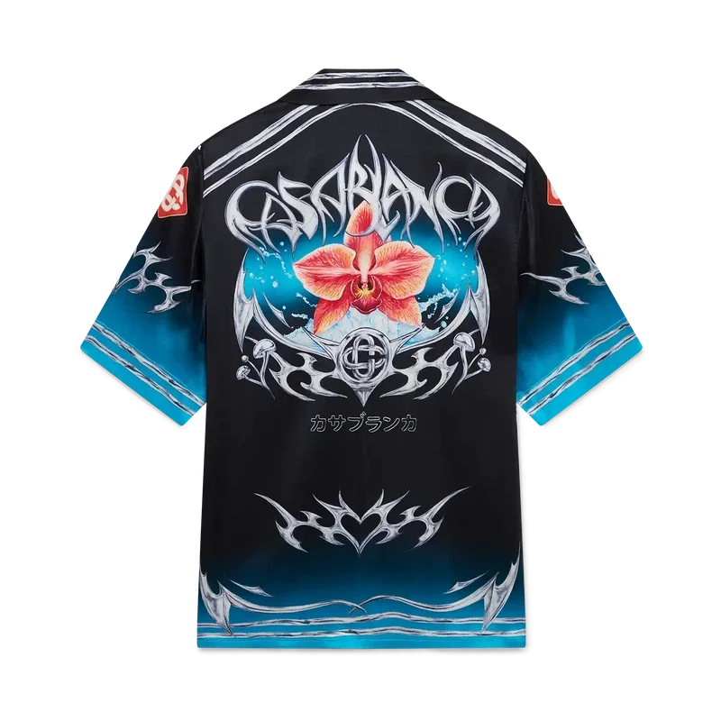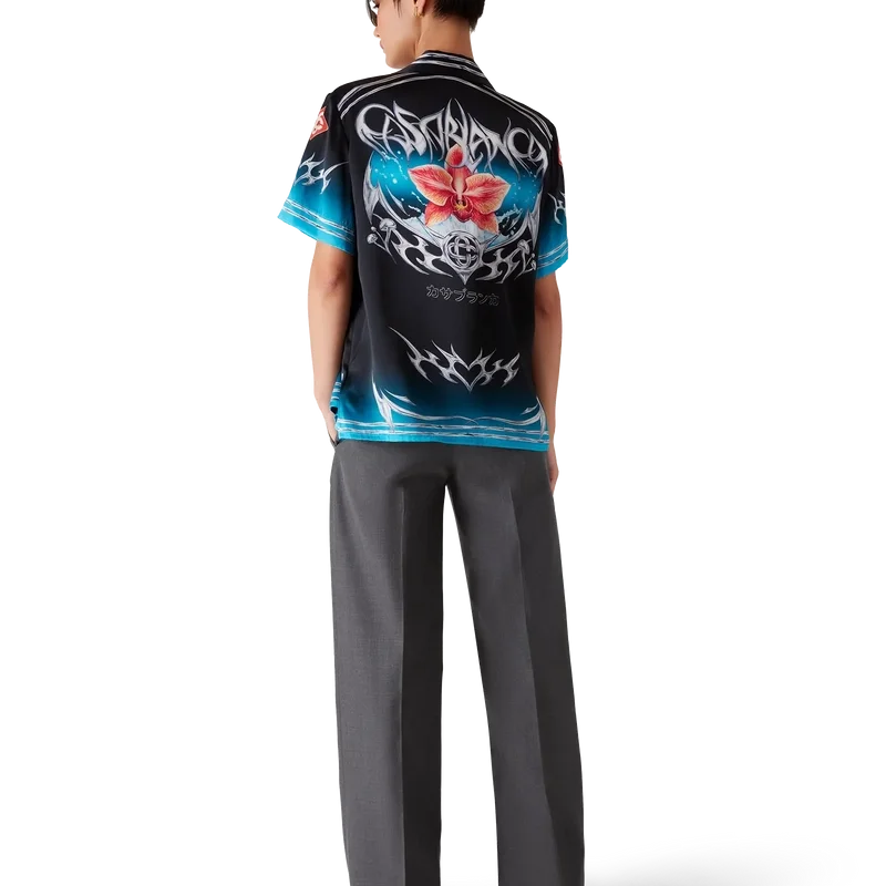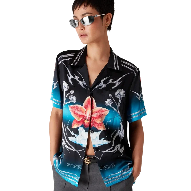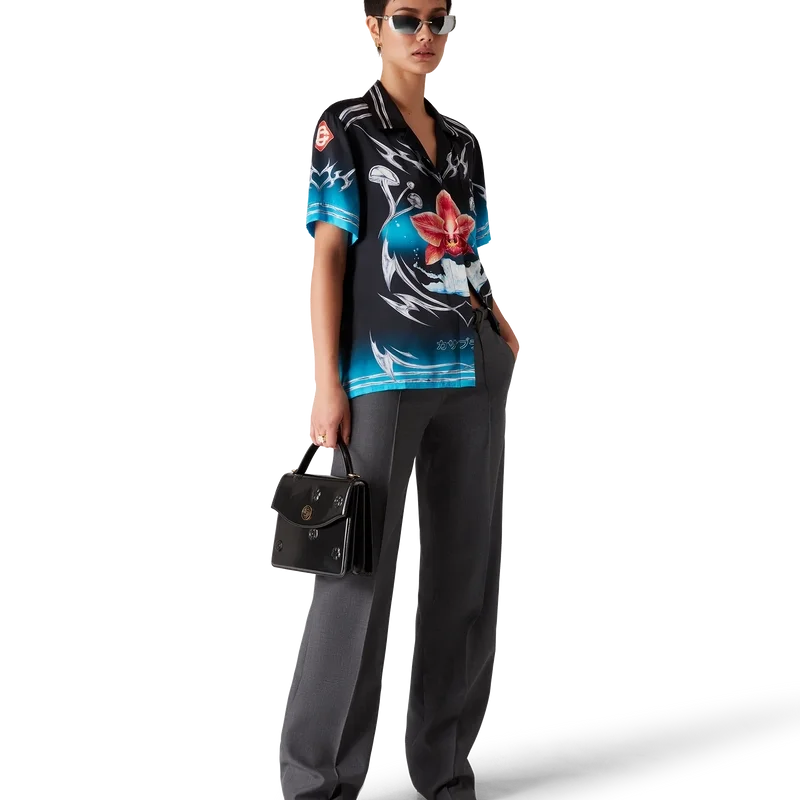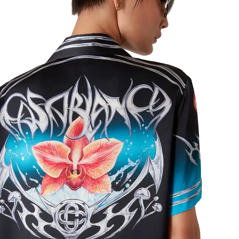 Cămășa din satin de mătase cu mâneci scurte Blades are un design imprimat cu un motiv artistic care joacă cu contrastul dintre două sentimente opuse – ascuțimea lamei și cromul rece, argintiu, contrastând cu căldura naturii, precum tonurile îndrăznețe de roz și roșu ale unei flori de orhidee. Adăugarea apei conferă designului un element proaspăt și revigorant. Cămașa este completată de un guler cubanez, un buzunar la piept, închidere cu nasturi și nasturi Cc Corozo interconectați, caracteristici ale mărcii.