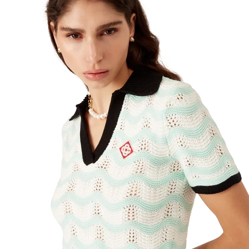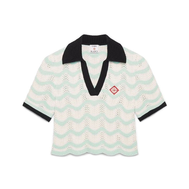 Tricoul polo scurt din bumbac croșetat cu model de valuri este un model cu mâneci scurte, care prezintă logo-ul în formă de diamant, semnătura casei, realizat din țesătură de bumbac croșetată. Completat cu guler în V, guler, tiv inspirat de valuri și placket, manșete și guler din tricot cu nervuri negru contrastant – conceput pentru a se potrivi deasupra buricului.