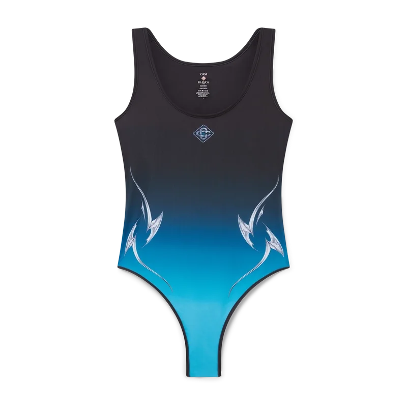 Costumul de baie Blades este un design imprimat, realizat dintr-un material tehnic respirabil pentru înot, cu un imprimeu care joacă cu contrastul dintre două sentimente opuse – ascuțimea lamei și cromul rece, argintiu, contrastând cu căldura naturii, precum tonurile îndrăznețe de roz și roșu ale unei flori de orhidee. Adăugarea apei conferă designului un element proaspăt și revigorant. Costumul este completat de croiul înalt al picioarelor, decolteul rotund, decupajul din spate și logo-ul în formă de diamant, semnătura casei, pe piept.