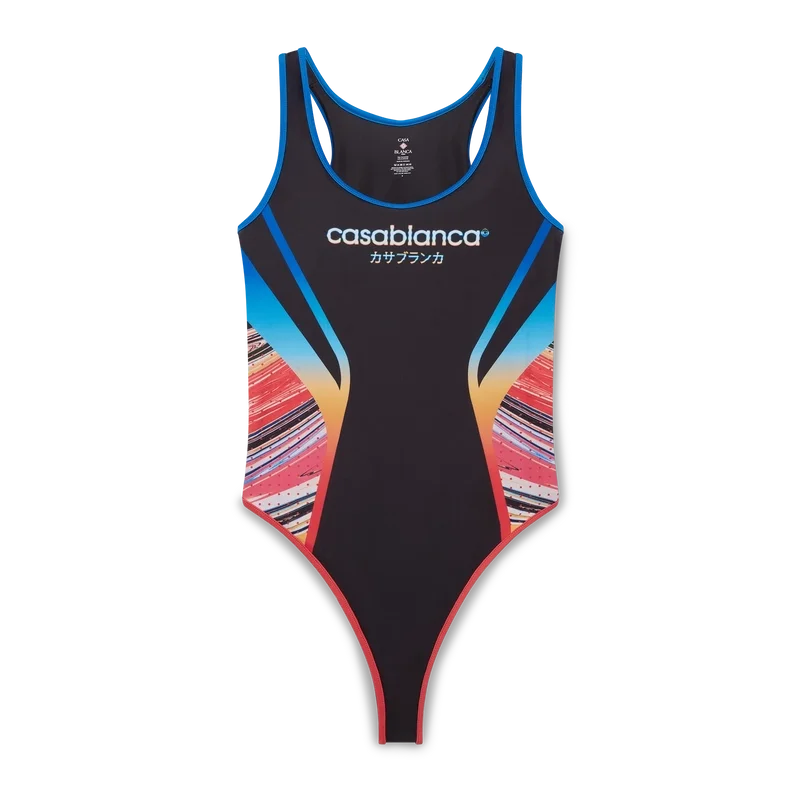 Costumul de baie Marble are un design imprimat, fiind confecționat dintr-un material tehnic respirabil pentru înot, cu logo-ul Casablanca al casei de modă pe piept și un imprimeu multicolor cu efect de marmură pe panourile laterale. Este completat de croi înalt la picioare, decolteu rotund, decupaj la spate și detalii de bordură albastră și portocalie.