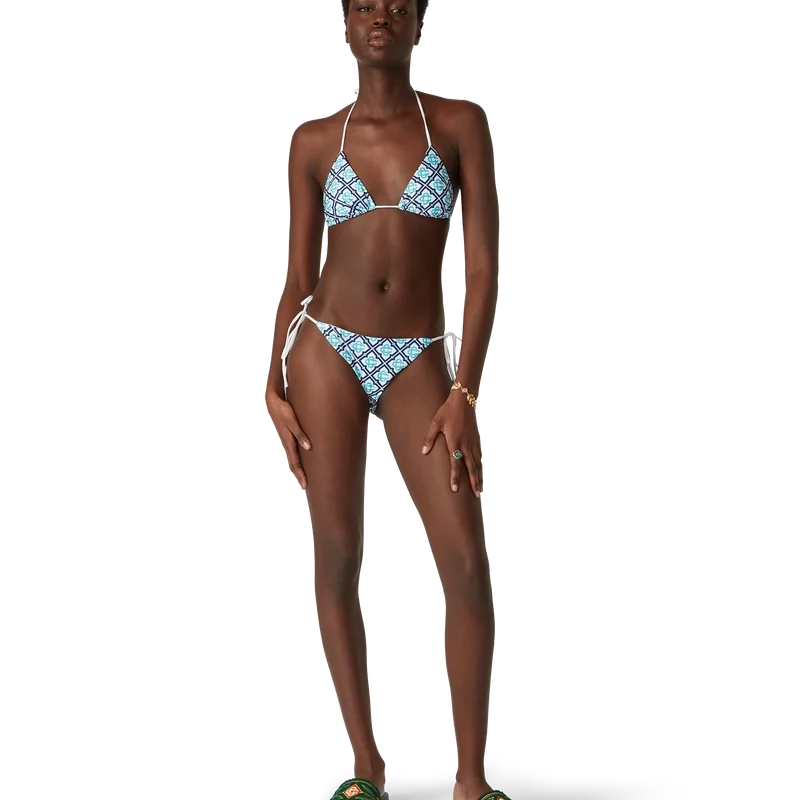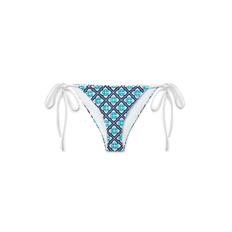 Slipul de bikini Monogram are un design imprimat, realizat dintr-un material tehnic respirabil, cu un monogram în degrade care oferă o variantă a imprimeului semnătura Casablanca. Completat cu finisaje albe și închidere cu șnururi – această piesă prezintă nitul Cc interconectat, semnătura casei – destinat a fi purtat cu topul asortat.