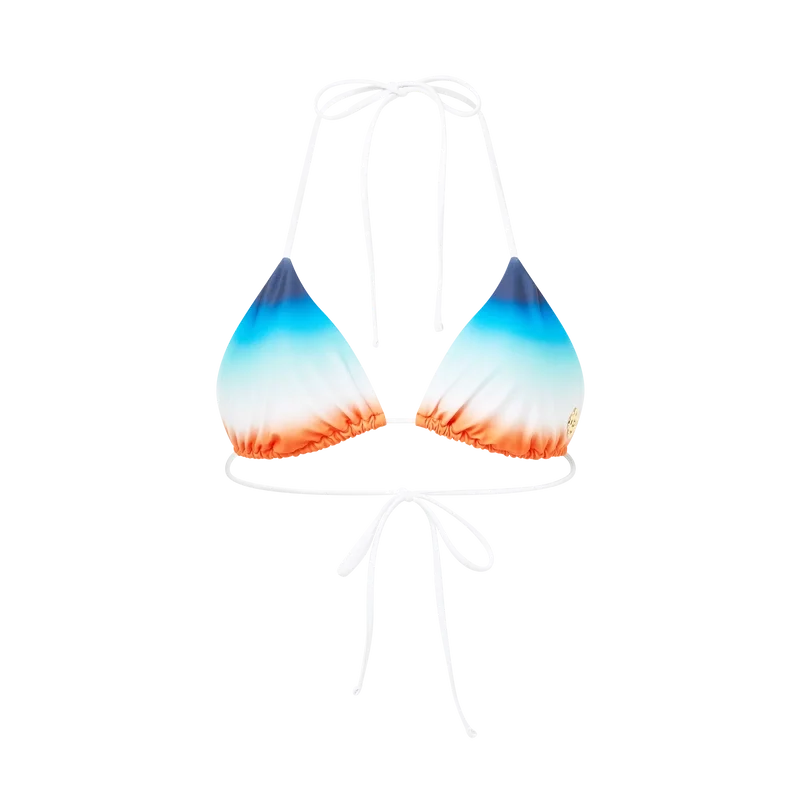 Topul de bikini Gradient are un design imprimat în formă triunghiulară, confecționat dintr-un material tehnic respirabil, prezentând o paletă restrânsă de albastru, aqua, alb și portocaliu într-un gradient de culori creat special pentru colecție, confecționat dintr-un material tehnic. Completat cu finisaje albe și închidere cu șnur la gât și spate, – această piesă prezintă nitul Cc interconectat, semnătura casei, pe cupă stângă. Această piesă este completată cu pernițe detașabile și este destinată a fi purtată cu slipurile asortate.