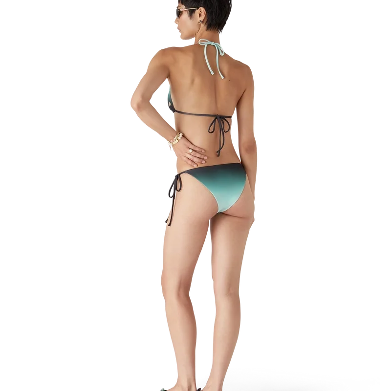 Topul de bikini Gradient are un design imprimat, realizat dintr-un material tehnic de înot respirabil, prezentând un gradient de culoare mentă care utilizează paleta de culori a hotelului Park Hyatt, un hotel iconic din Tokyo care folosește mentă și negru în designul interior. Completat cu închideri cu șnururi la gât și spate – această piesă este concepută pentru a fi purtată cu slipul de bikini asortat.