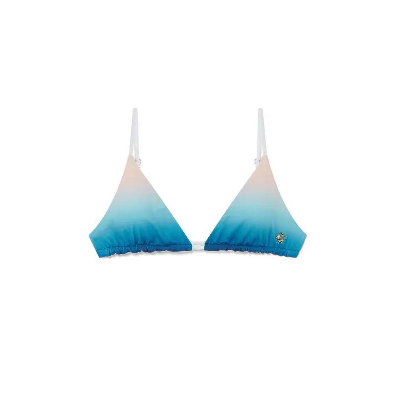 Topul de bikini Gradient are un design imprimat, fiind confecționat dintr-un material respirabil din amestec de poliester, cu culorile degradate ale sezonului. Completat cu șnururi albe contrastante – această piesă este concepută pentru a fi purtată cu slipul de bikini asortat.