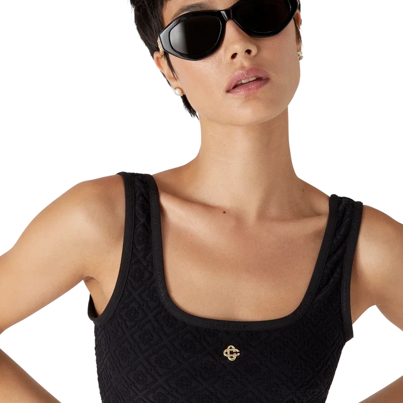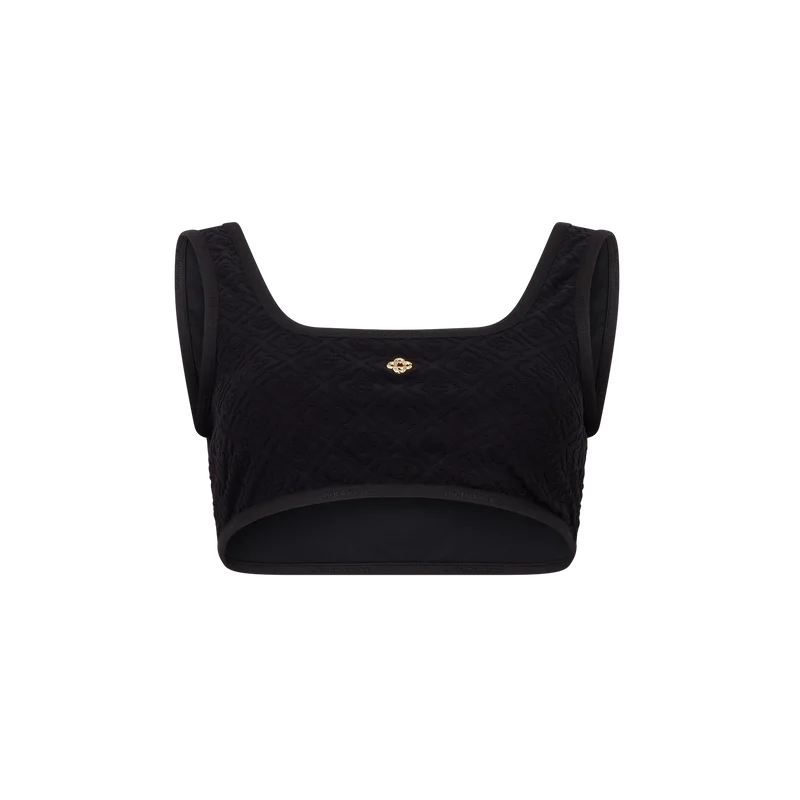 Topul de bikini Monogram Jacquard este confecționat dintr-un material tehnic de înot respirabil, având nitul interconectat CC placat cu aur, semnătura casei. Completat cu bretele – această piesă este concepută pentru a fi purtată cu slipul de bikini asortat.