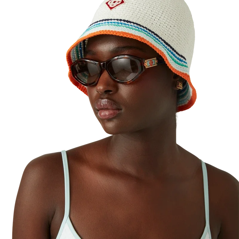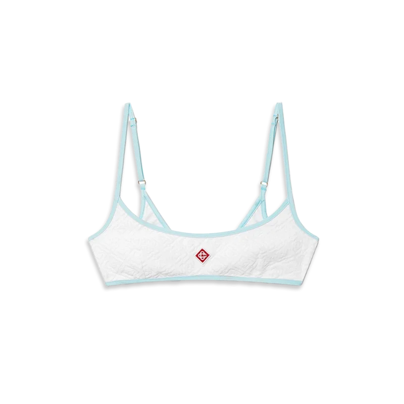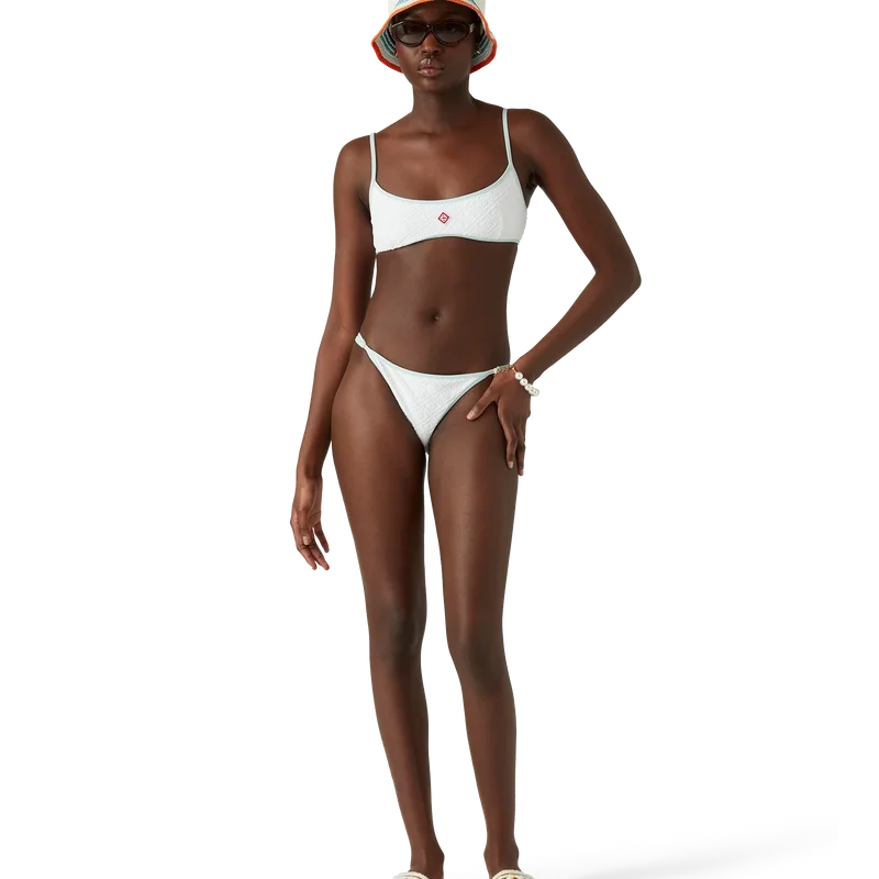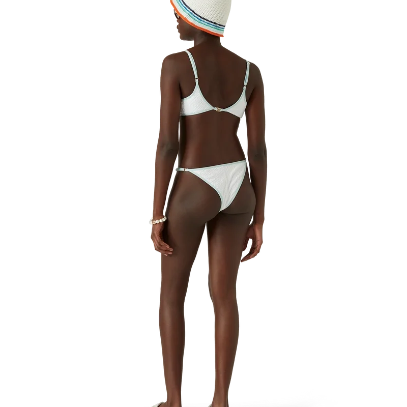 Topul de bikini Jacquard Monogram este un model imprimat, confecționat dintr-un material respirabil din amestec de poliester, care prezintă Diamond Monogram, semnătura casei. Completat cu bretele subțiri de culoare albastru deschis și finisaje, acest articol este conceput pentru a fi purtat împreună cu slipul de bikini asortat.
