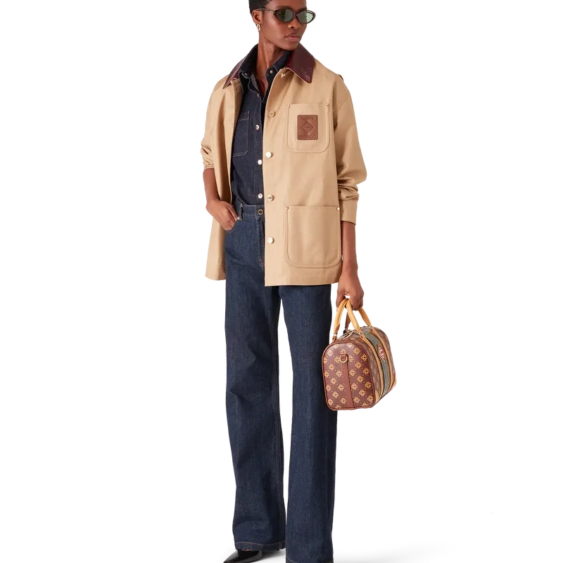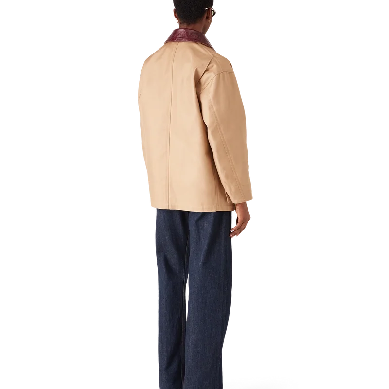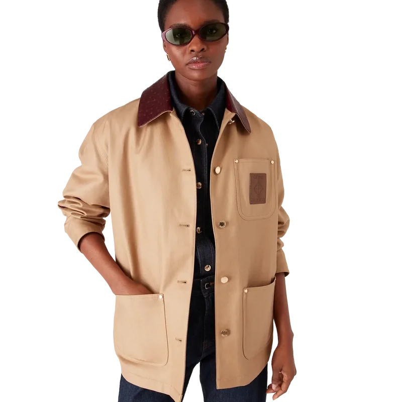 Jacheta de lucru bej este un model lejer, cu mâneci lungi, confecționat din țesătură de bumbac drill, care reinterpretează codurile utilitare prin prisma rafinată a casei de modă. Completată cu guler contrastant, buzunar la piept cu patch din piele cu logo, buzunare aplicate în față, închidere cu nasturi și accesorii placate cu aur.