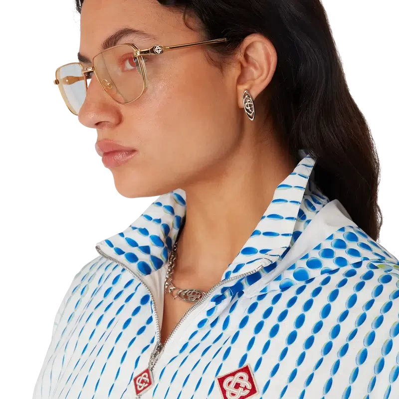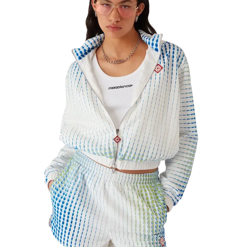 Jacheta Dots Windbreaker este un articol de îmbrăcăminte sport realizat dintr-un material tehnic de tafta, cu măiestria caracteristică casei, prezentând motive în degrade și efecte de textură. Completată cu mâneci lungi, glugă cu închidere cu șnur, manșete și tiv elasticizate, închidere cu fermoar cu limba de fermoar în formă de diamant, semnătura casei, și logo-ul cu diamant al casei.