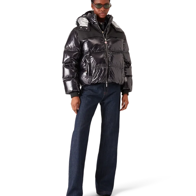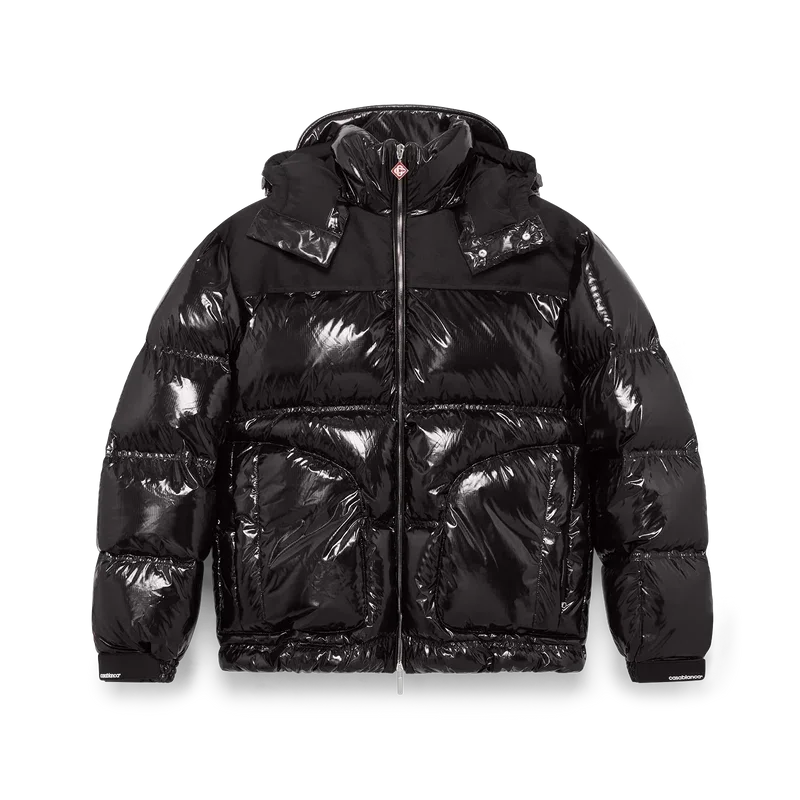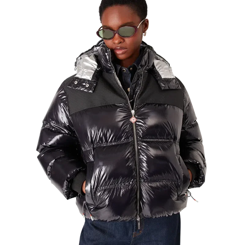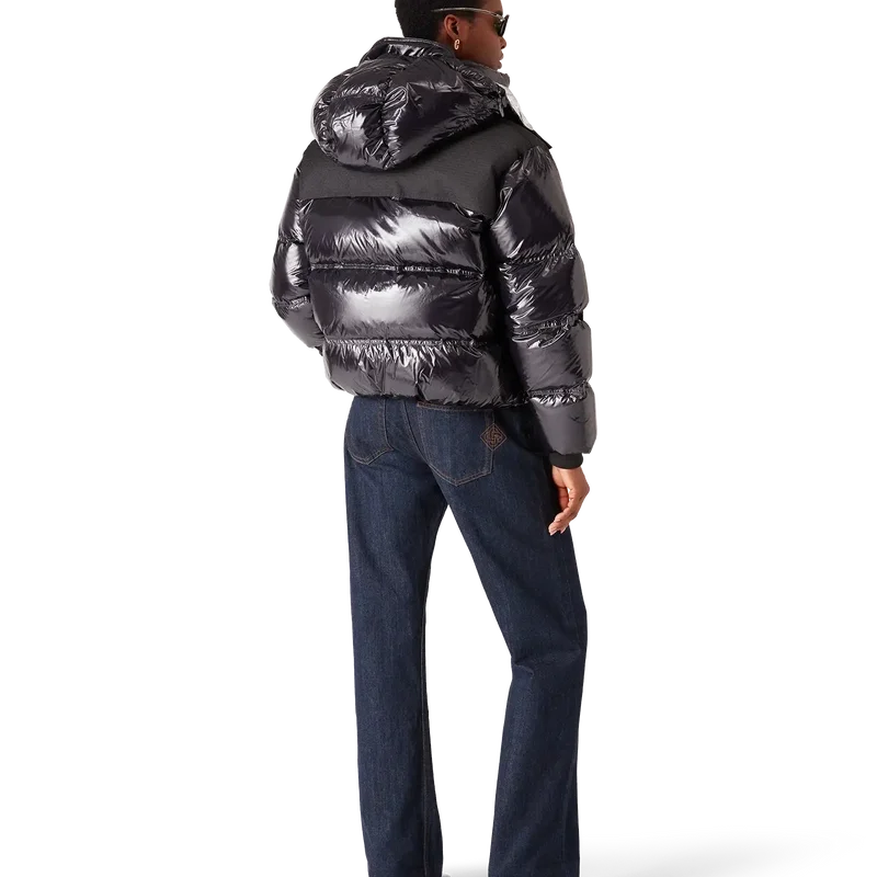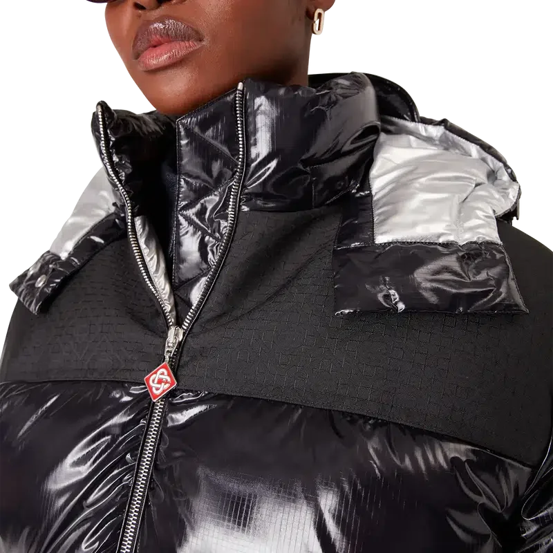 Jacheta matlasată din puf de nailon este o piesă de îmbrăcăminte de exterior modernă, cu croială dreptunghiulară, confecționată din țesătură de nailon Ripstop, cu umplutură din puf și panou jacquard cu monogramă contrastantă pe umeri. Completată cu o glugă prevăzută cu cordoane cu logo CC și închidere cu șnur, guler ridicat care oferă căldură suplimentară și protecție împotriva intemperiilor, închidere cu fermoar cu tirant cu logo-ul diamant caracteristic casei, buzunare frontale cu închidere cu fermoar, curele reglabile cu logo la mâneci și tiv și mâneci elasticizate.