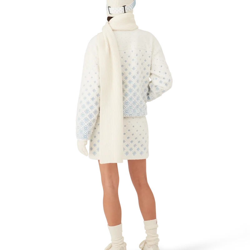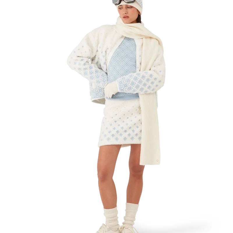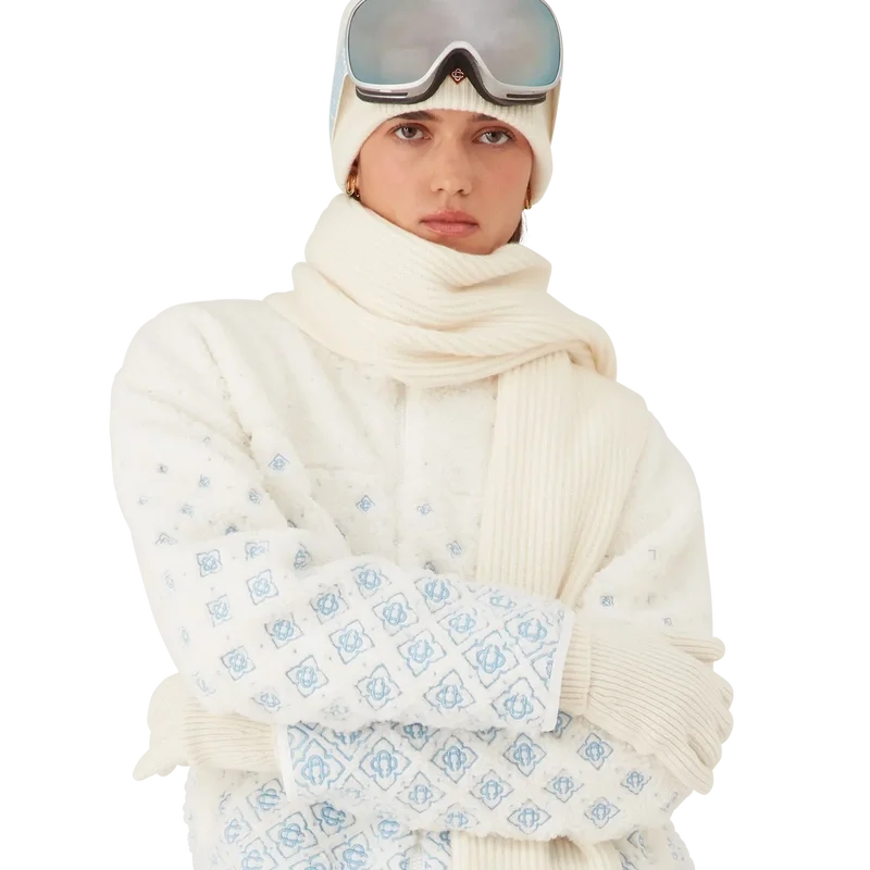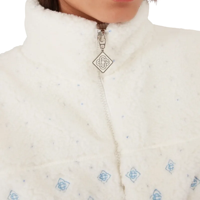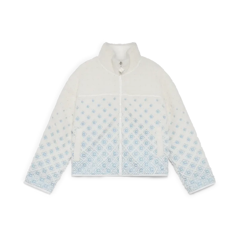 Jacheta scurtă din fleece cu monogramă brodată în degrade este o piesă de îmbrăcăminte de exterior rafinată, confecționată din țesătură tehnică din fleece de culoare albă, inspirată de texturile catifelate ale legendarului zăpadă pudră din Japonia. Inspirată de confortul primitor al vieții tradiționale de la țară, unde izvoarele termale aburinde oferă o pauză de la frigul iernii, iar ninsoarea moale învelește lumea. Acest model prezintă grafica monogramă semnată de casă, completată de închidere cu fermoar în față și capse argintii.