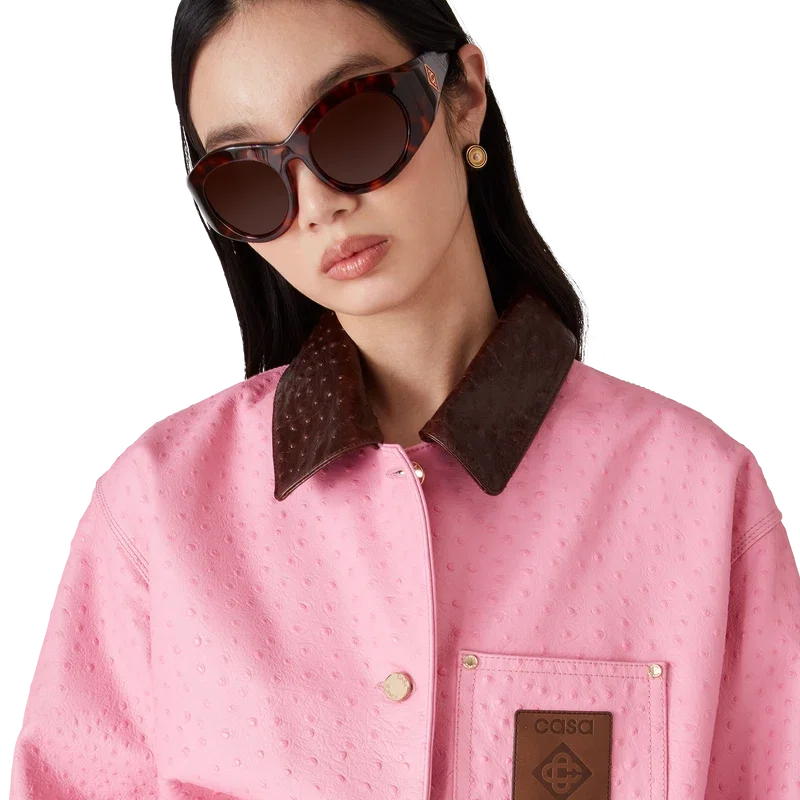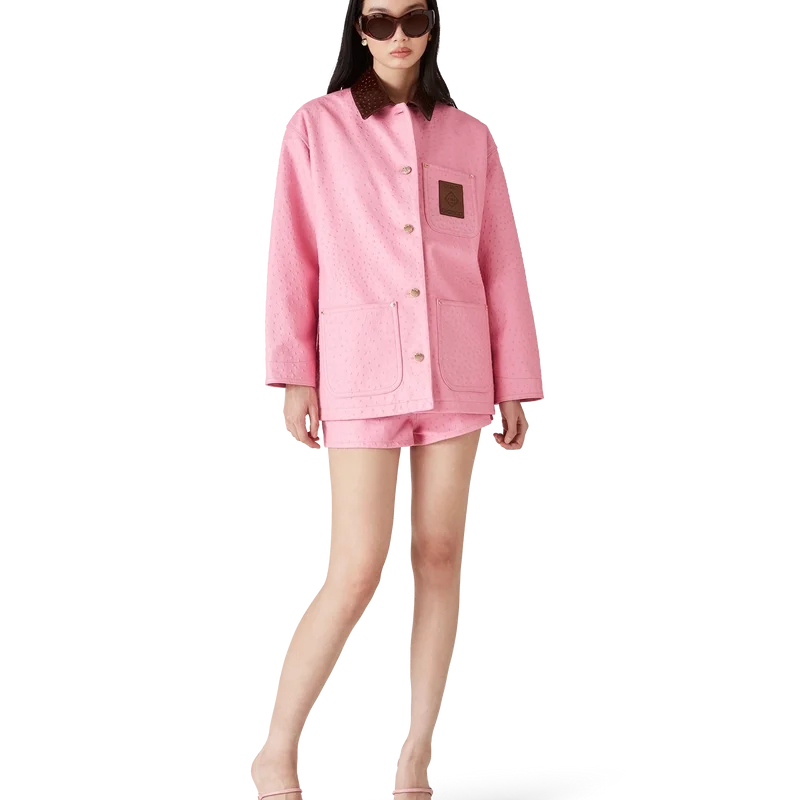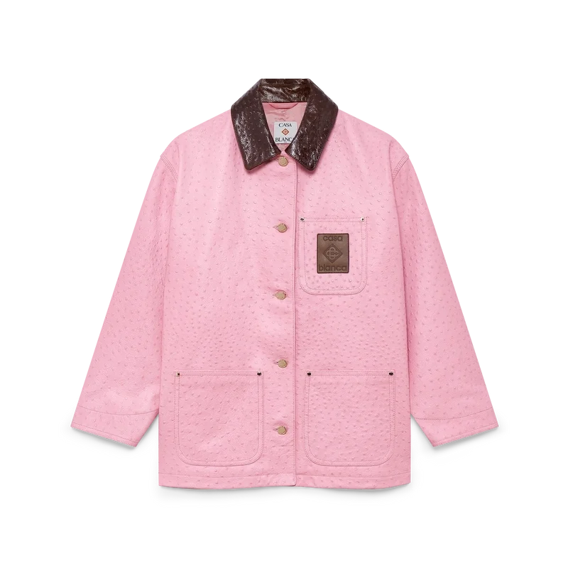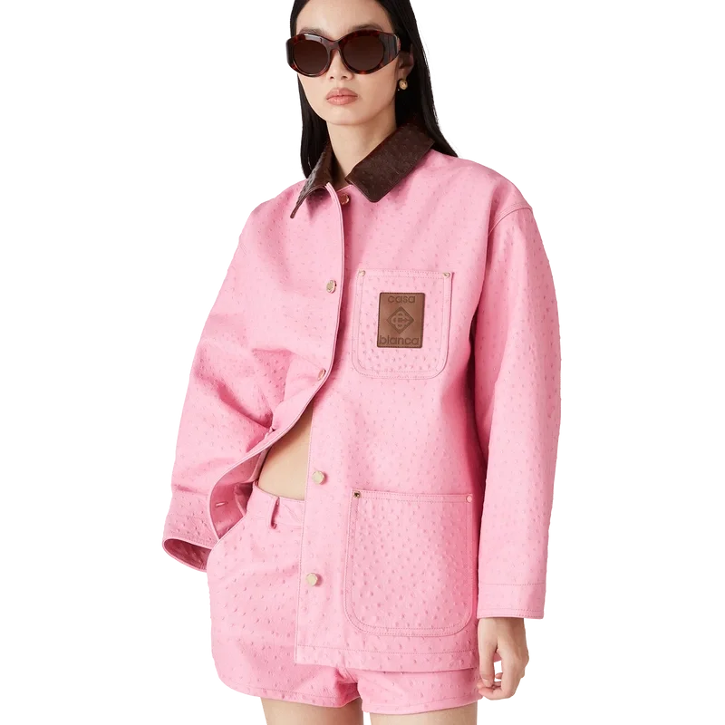 Paltonul de lucru din piele cu relief are un design lejer și relaxat, fiind confecționat din piele de vițel italiană. Prezintă un model imprimat cu efect de piele de struț, guler în contrast, un buzunar la piept cu o emblemă din piele cu logo, buzunare aplicate în față, închidere cu nasturi și accesorii metalice placate cu aur.