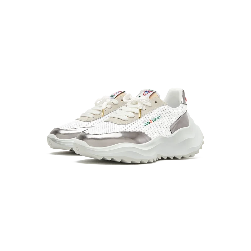 Suprapuneri din piele lăcuită cromată în nuanțe asortate, parte superioară din piele perforată, șireturi din piele de căprioară contrastante, patch din cauciuc cu diamantul Casablanca pe limba călcâiului, etichetă țesută Casa Sport pe panoul lateral, etichetă țesută Atlantis pe limbă, talpă intermediară sculptată din EVA Wave, talpă exterioară din cauciuc, capete de șireturi aurii