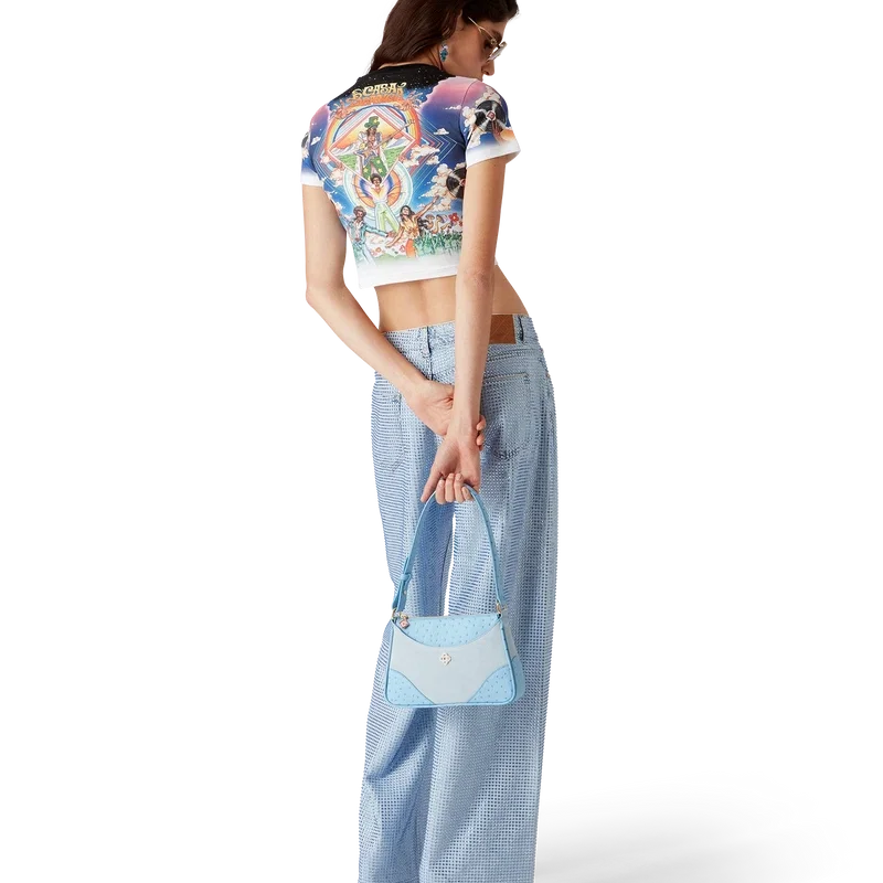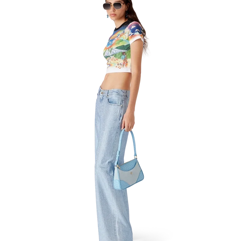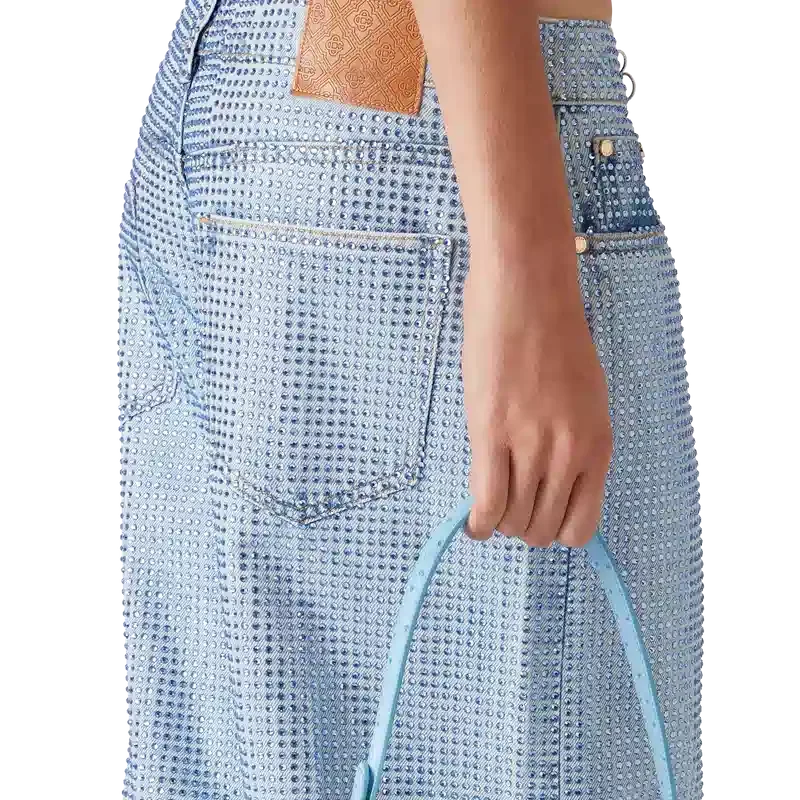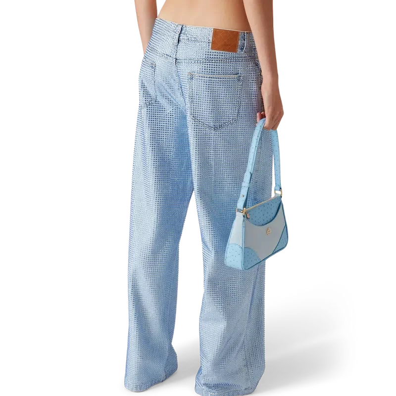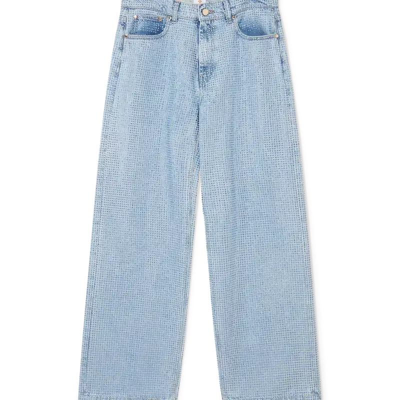 Blugii cu cristale sunt un model cu croi drept, confecționați din țesătură de bumbac și prezintă cristale Hotfix într-un model pe toată suprafața. Sunt completați cu accesorii placate cu aur, bucle pentru curea, buzunare față și spate, o emblemă din piele cu logo și închidere cu fermoar.