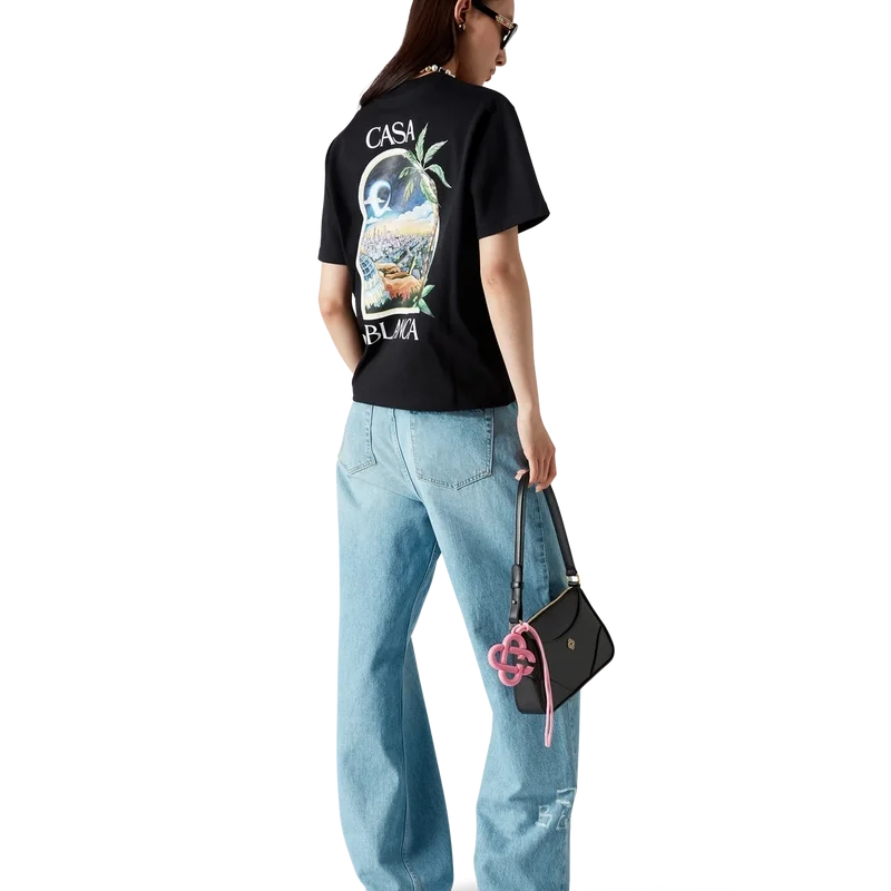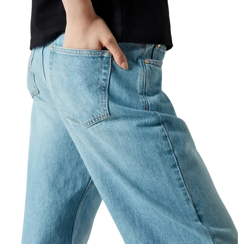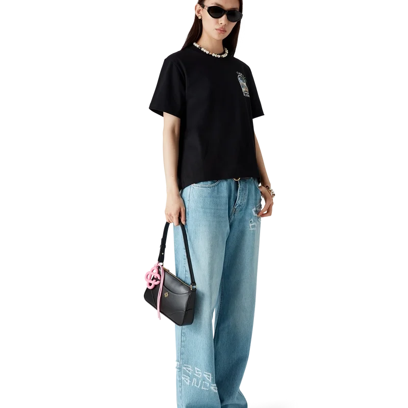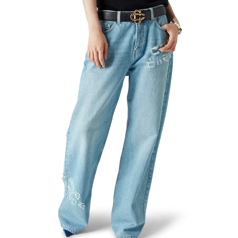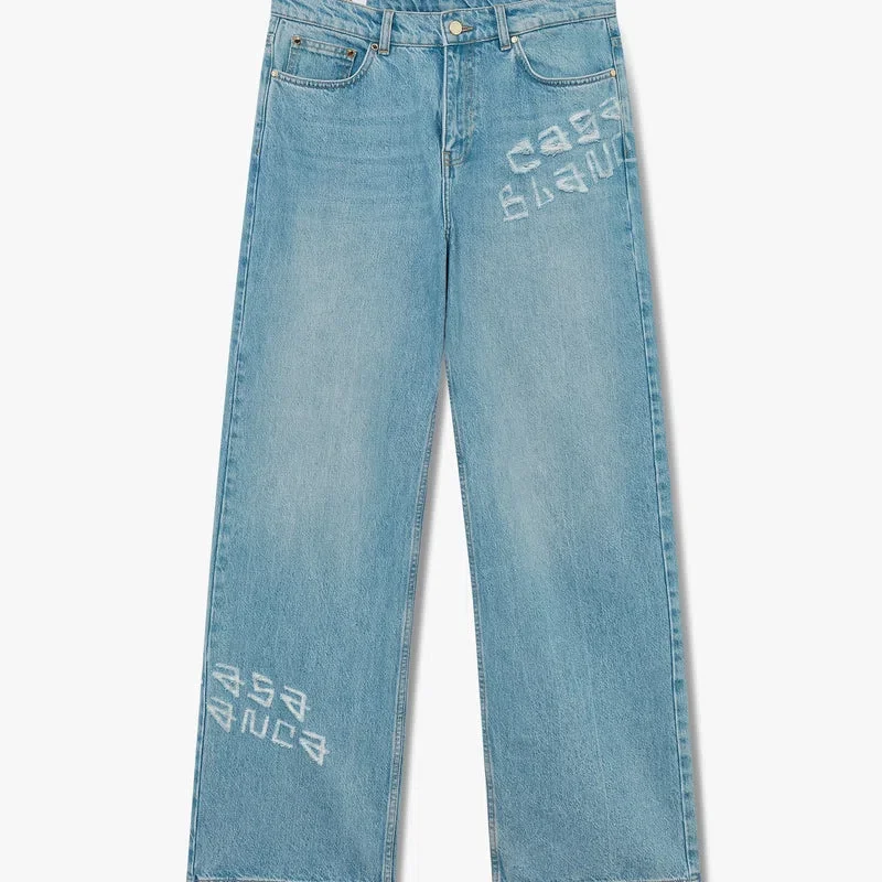 Blugii din denim cu aspect uzat și graffiti au un design cu croi drept, sunt confecționați din țesătură de bumbac și prezintă logo-ul caracteristic suprapus, în stil graffiti, gravat în țesătură. Sunt completați cu accesorii placate cu aur, bucle pentru curea, buzunare față și spate, o emblemă din piele cu sigla mărcii și închidere cu fermoar.