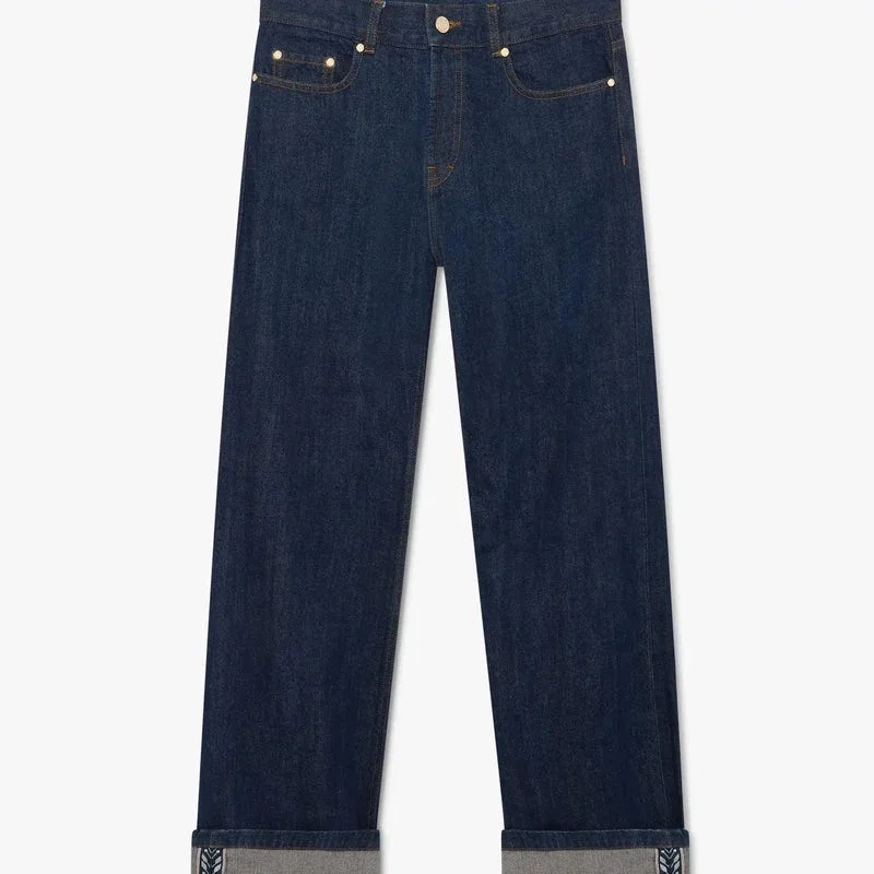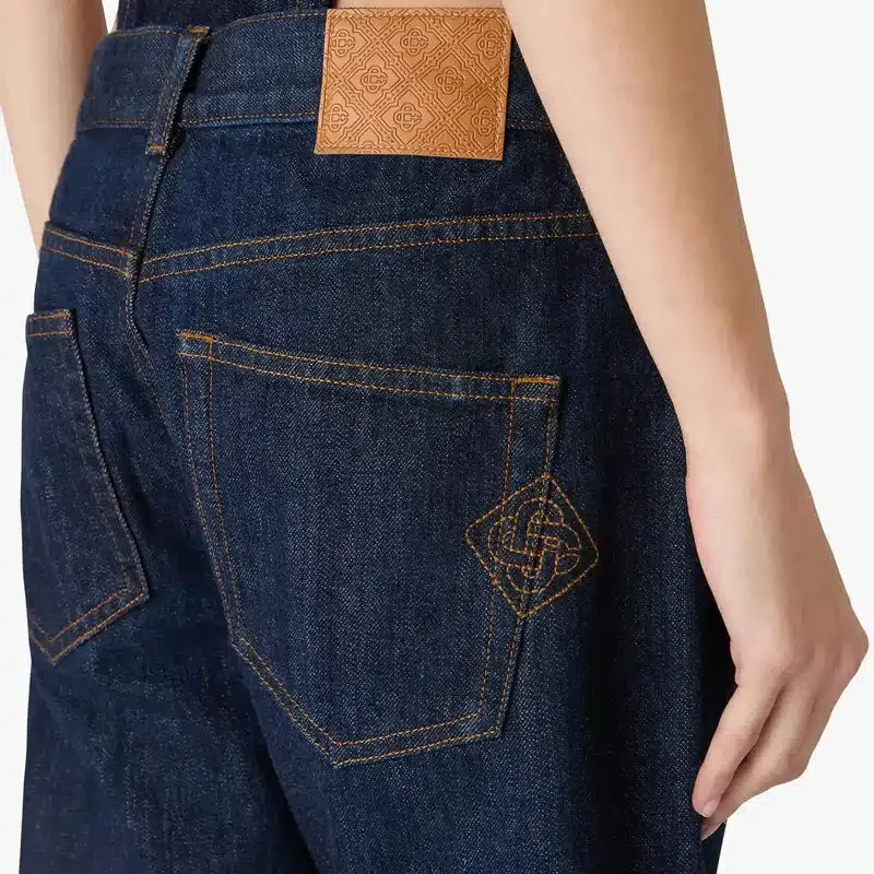 Blugii largi indigo au un design cu croi drept, fiind confecționați din țesătură de bumbac denim într-o nuanță intensă de indigo. Prezintă bucle pentru curea, închidere cu fermoar, buzunare față și spate și o siluetă largă și relaxată.