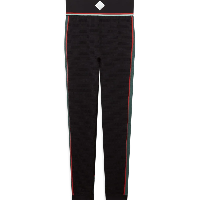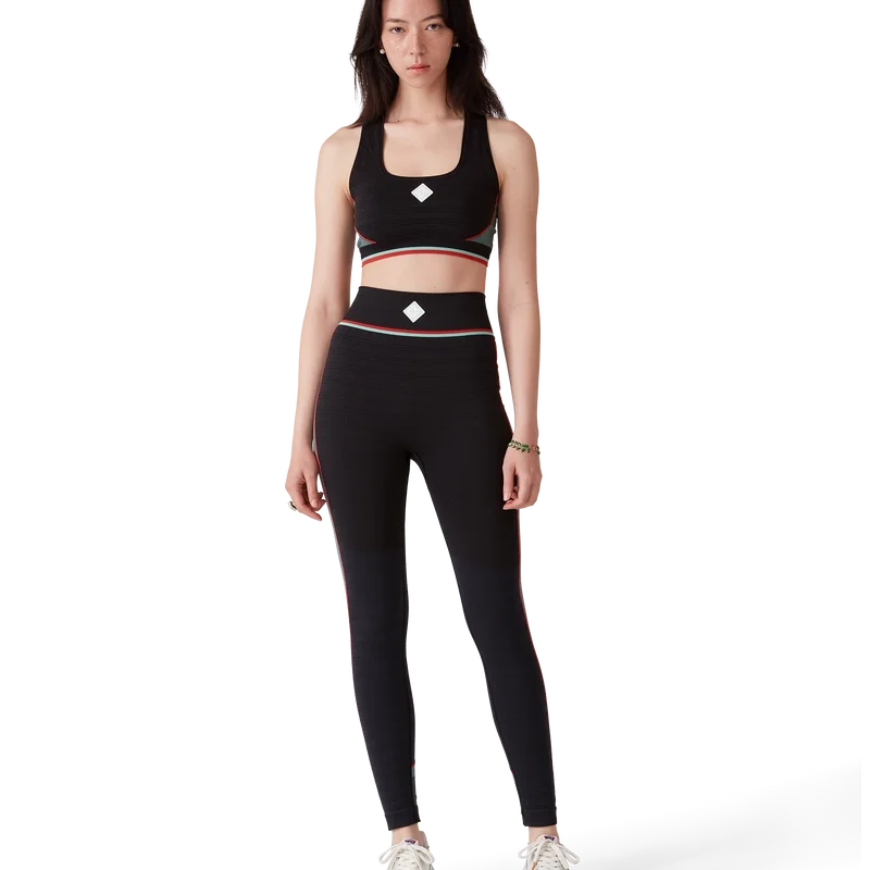 Colanții sport fără cusături au un design inspirat de îmbrăcămintea sport, în stil lung, confecționați dintr-un material elastic fără cusături. Prezintă o bandă elastică în talie cu logo-ul în formă de diamant al casei și detalii pe panouri.