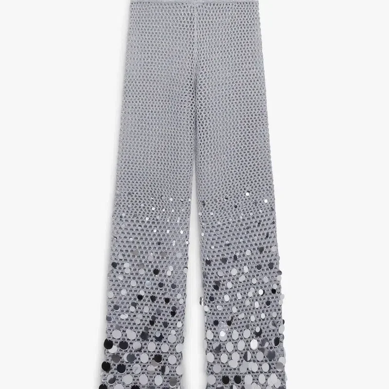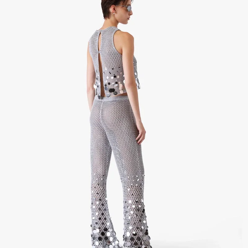 Pantaloni argintii cu croșetat oglindă au un design rafinat, tricotat, cu o construcție delicată din croșetat oglindă argintiu. Sunt completați cu o bandă la talie, un tiv evazat și o siluetă ajustată și evazată.