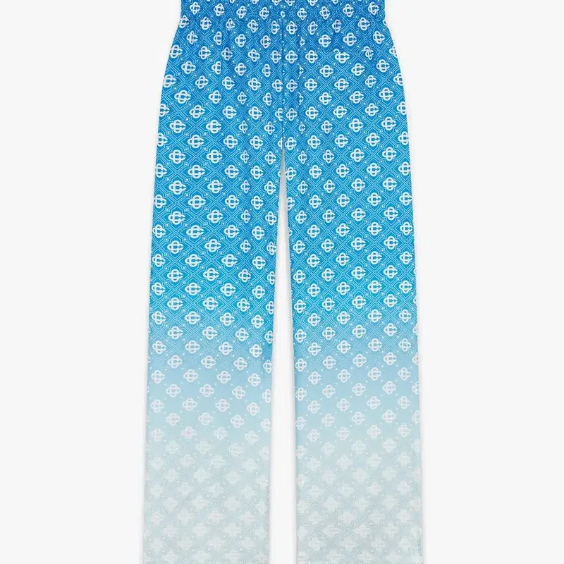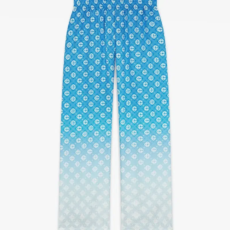 Pantaloni din mătase cu Diamond Monogram în formă de romburi cu gradient albastru au croială dreaptă și un imprimeu integral cu Diamond Monogram în formă de romburi cu gradient din colecția Art of the Silks a sezonului. Sunt prevăzuți cu talie elastică, închidere cu șnur, buzunare laterale în cusătură și o siluetă lejeră.