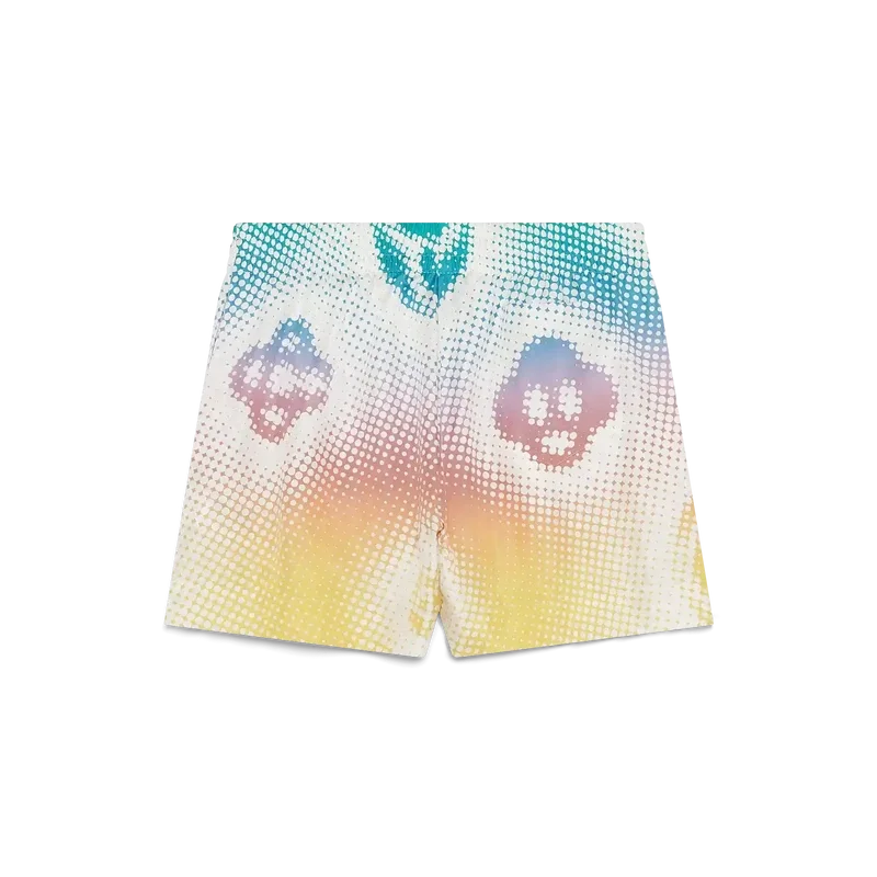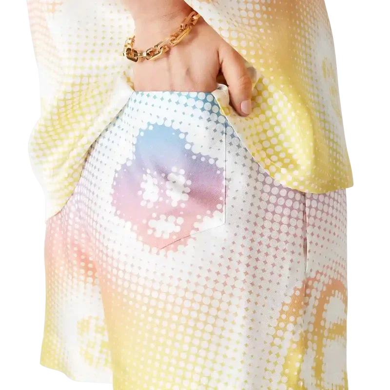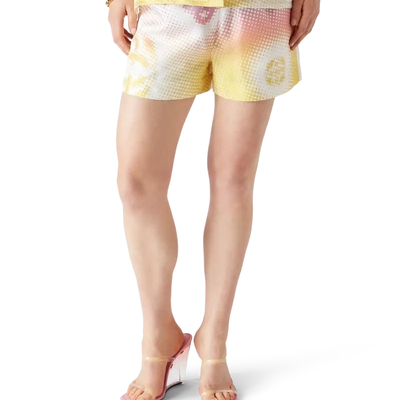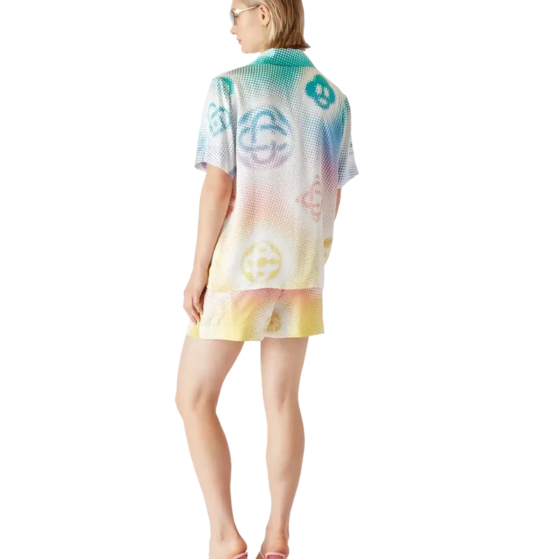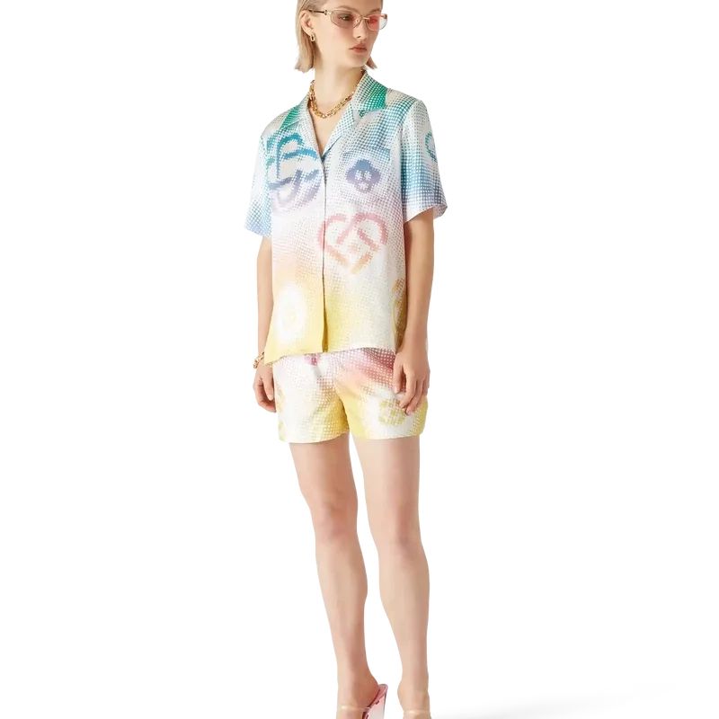Pantaloni scurți din mătase cu logo în semitonuri au un design imprimat pe toată suprafața, prezentând monogramele casei realizate prin aerografie, pornind de la experimentele noastre anterioare cu această tehnică. Sunt prevăzuți cu o bandă elastică la talie, un buzunar aplicat în spate și buzunare laterale în cusătură.