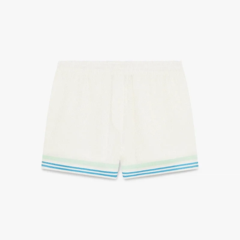 Pantaloni scurți din mătase jacquard cu monogramă florală Cc Smile au un design imprimat, prezentând colajul grafic al sezonului cu interpretări ale logo-ului, feței zâmbitoare și florii de orhidee. Sunt prevăzuți cu o bandă elastică în talie, închidere cu șnur, buzunare laterale în cusătură, un buzunar spate, detalii cu dungi verzi, albastre și albe la tiv și marginea buzunarelor, precum și o siluetă relaxată.