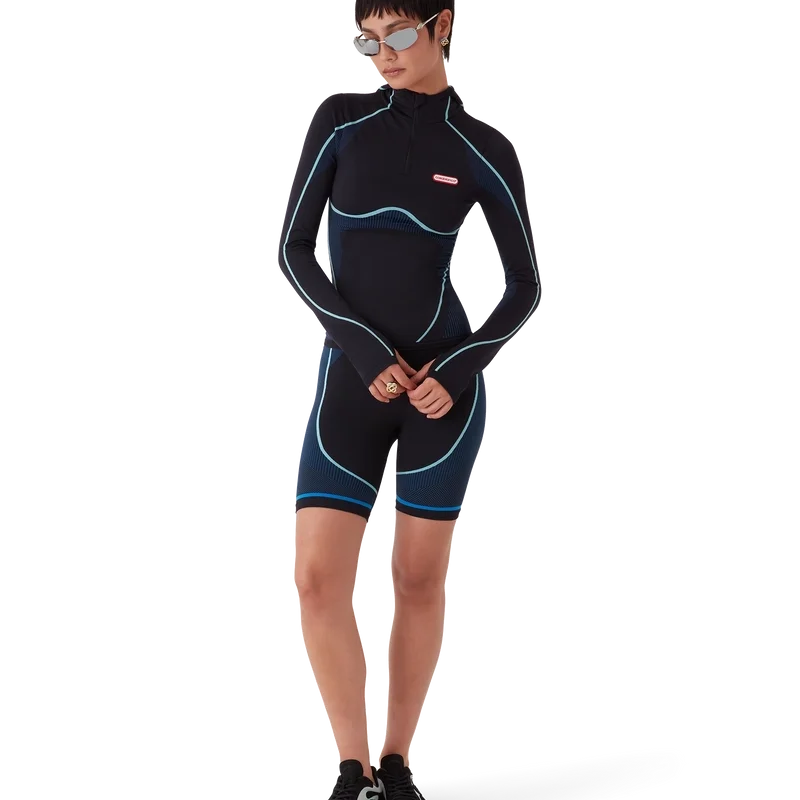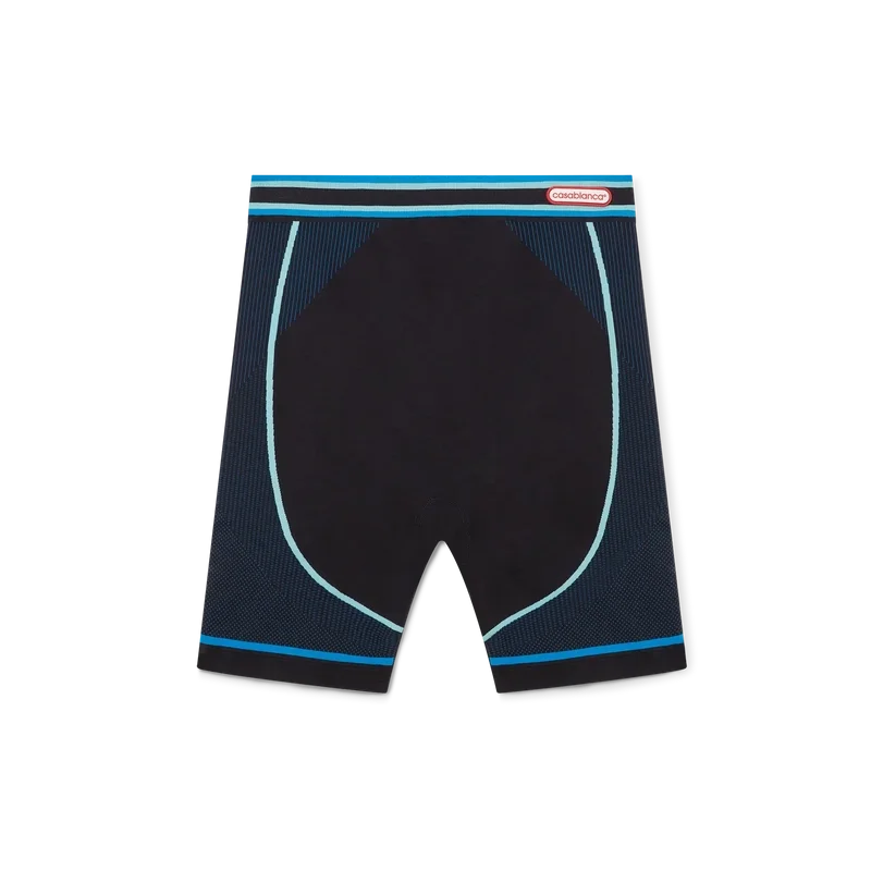 Pantaloni scurți fără cusături au un design inspirat din îmbrăcămintea sport, fiind confecționați dintr-un material elastic cu nervuri. Sunt prevăzuți cu o bandă elastică în talie, pe care se află logo-ul Casablanca, logo-ul interconectat Cc, semnătura casei, și detalii cu panouri.