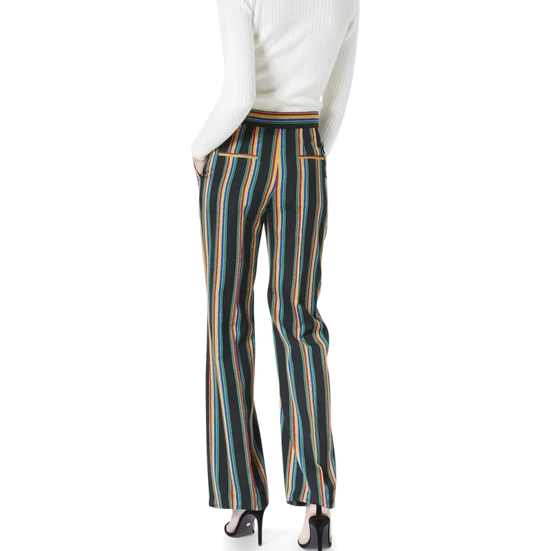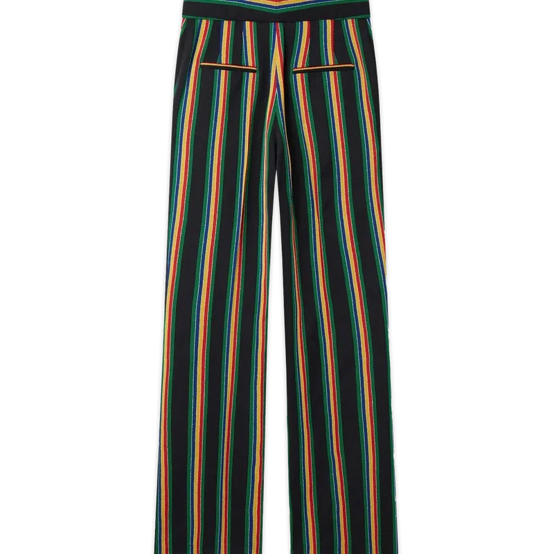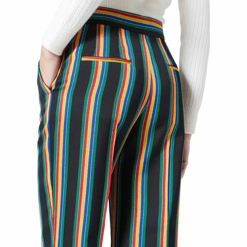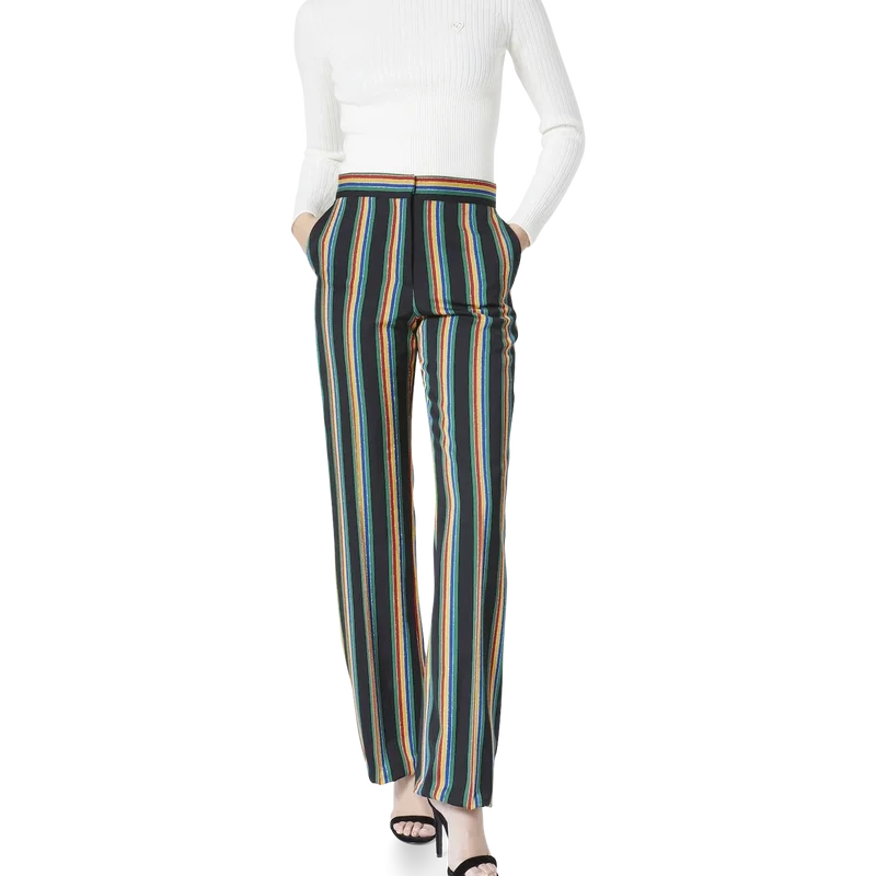 Pantaloni Medallion au un stil clasic, croiți pe măsură, cu un design cu dungi din lurex pe toată suprafața. Prezintă închidere cu fermoar în față și buzunare laterale, cu croială dreaptă. Destinate a fi purtate cu jacheta asortată.