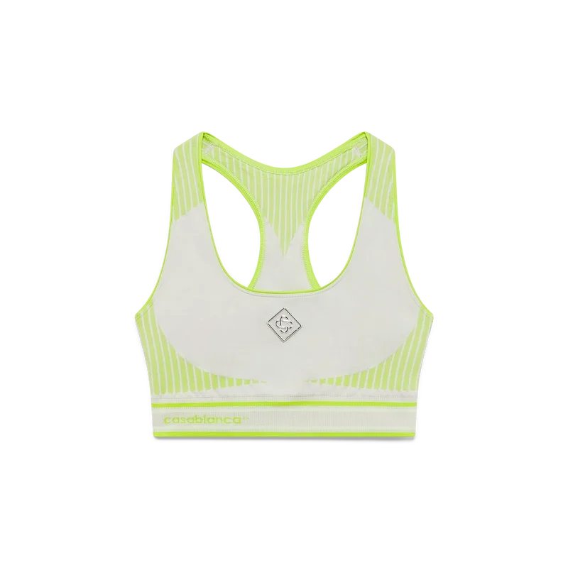 Sutienul sport fără cusături are un design fără mâneci, inspirat din îmbrăcămintea sport, cu Diamond Monogram-ul casei în centru. Această piesă este confecționată dintr-un material elastic fără cusături, cu bandă elastică, completată cu bretele, spate în formă de U și decolteu rotund.