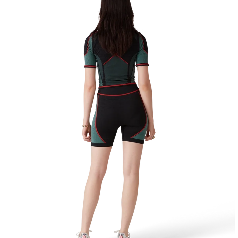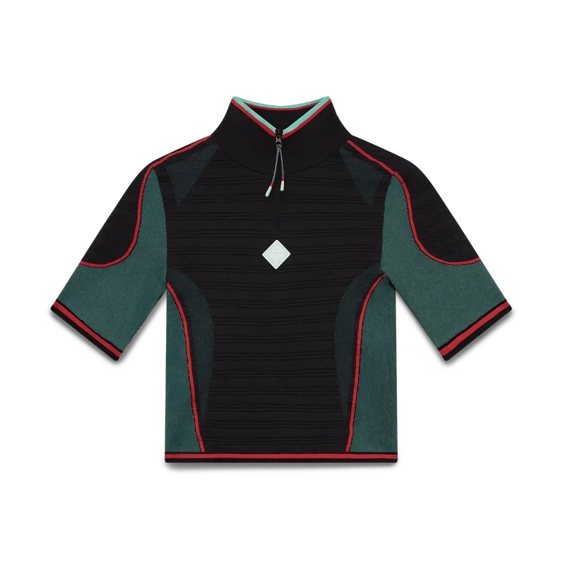 Cămașa fără cusături cu jumătate de fermoar este un model cu mâneci scurte, inspirat din îmbrăcămintea sport, confecționat dintr-un material elastic fără cusături. Prezintă închidere cu fermoar, guler polo și este decorată cu logo-ul în formă de diamant al casei de modă și detalii cu panouri.