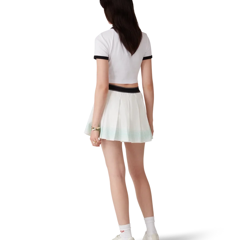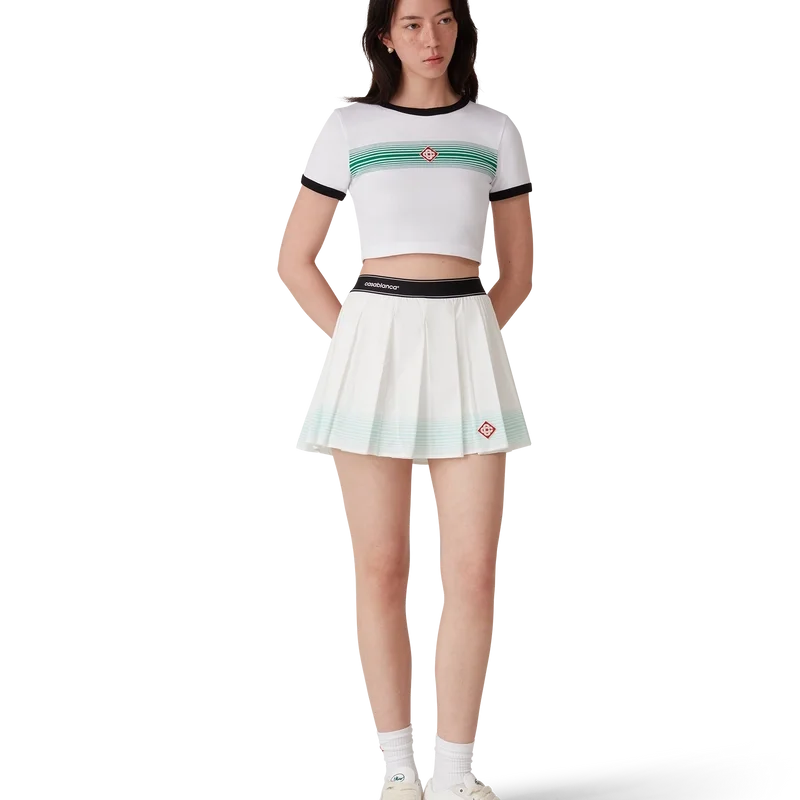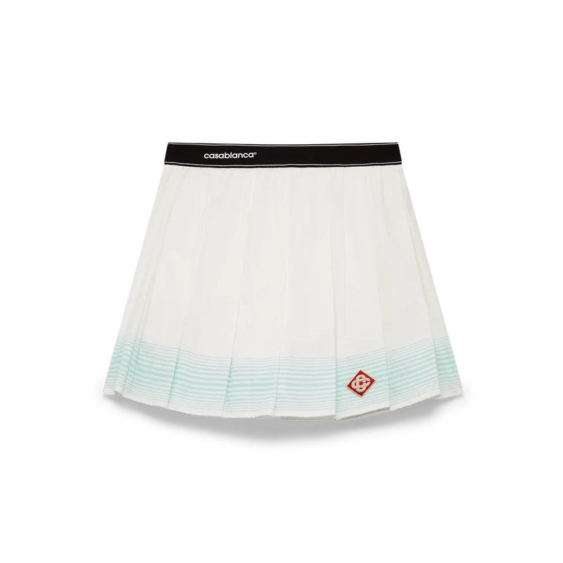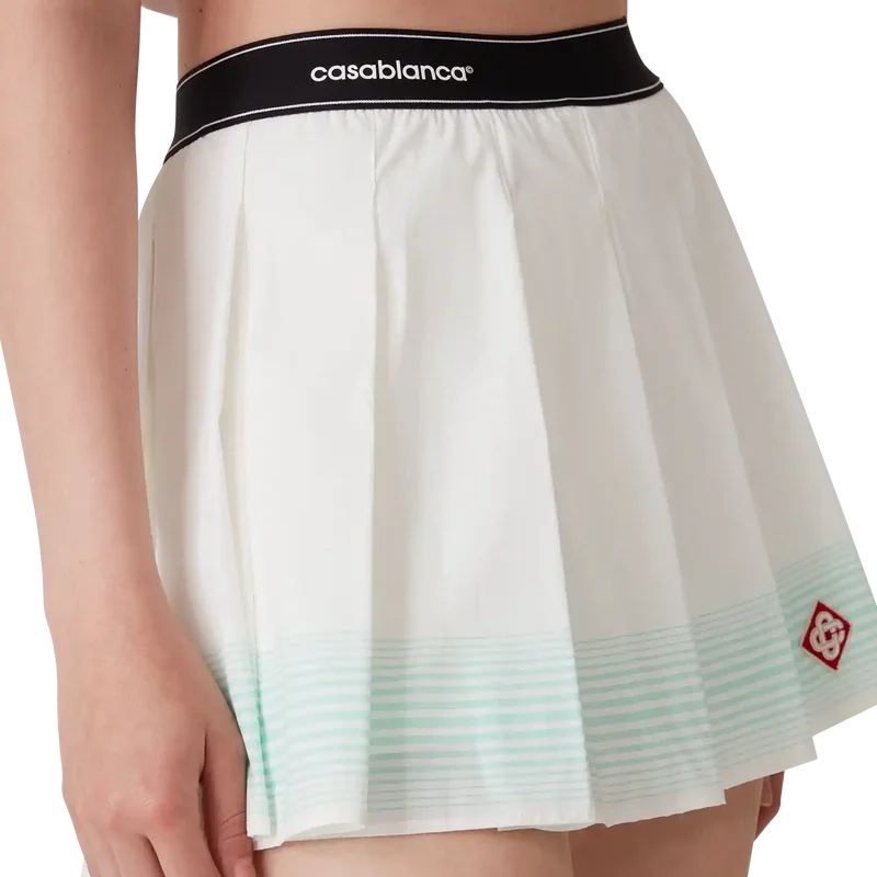 Fusta mini plisată cu dungi este un model scurt, cu logo-ul diamant caracteristic casei. Completată cu o bandă elastică contrastantă la talie cu logo-ul Casablanca imprimat în formă de cutie, detaliu cu dungi orizontale verzi în degrade la tiv și pantaloni scurți integrați.