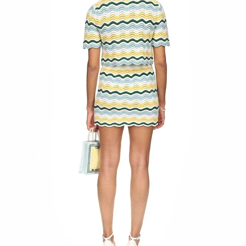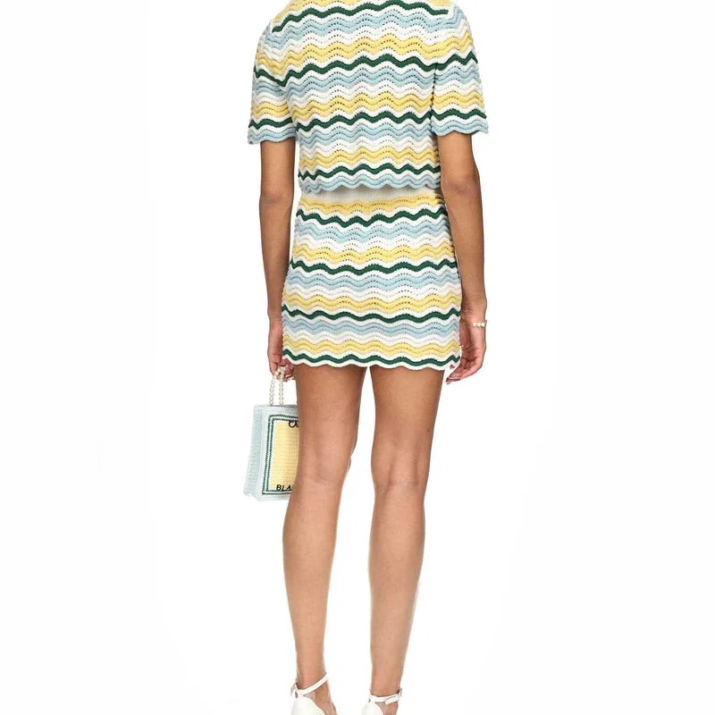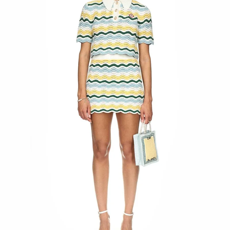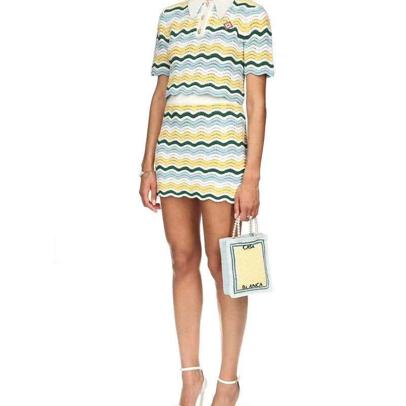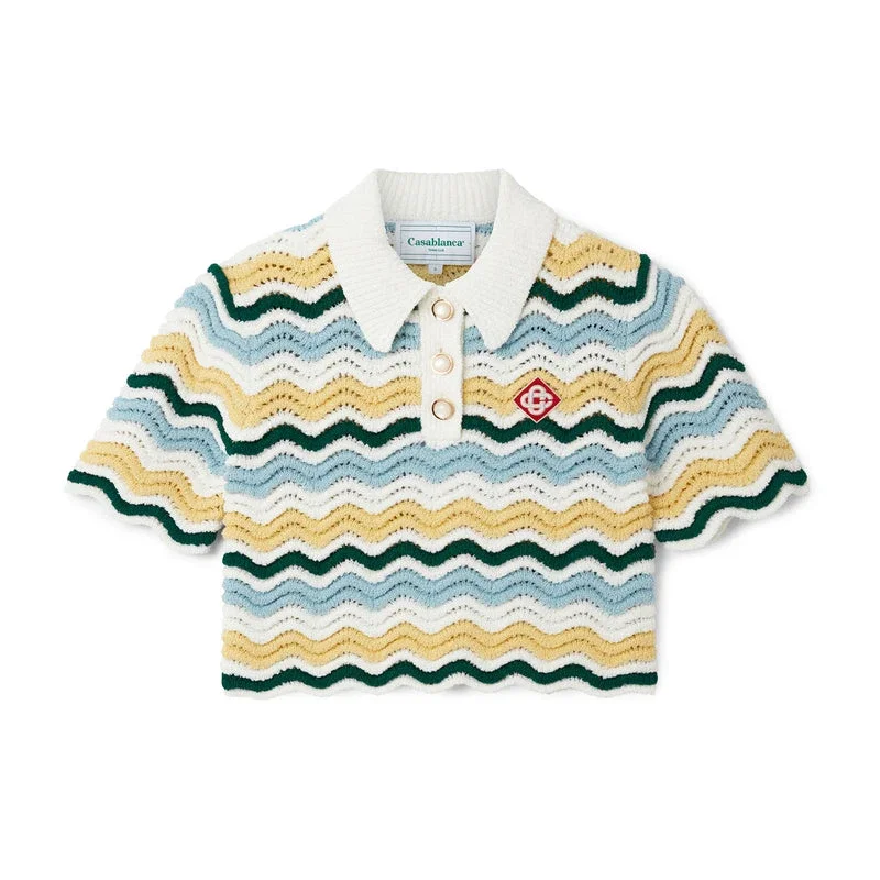 Topul Boucle Wave este un model emblematic Casablanca cu mâneci scurte, confecționat dintr-un material croșetat cu textură moale și țesătură deschisă, având guler și placket cu nervuri albe. Finisat cu logo-ul în formă de diamant al casei și eticheta cu marca Casablanca Paris, tricotajul din amestec de bumbac și nailon este conceput pentru a avea o croială slim.