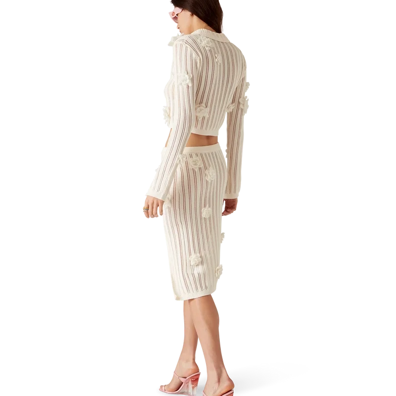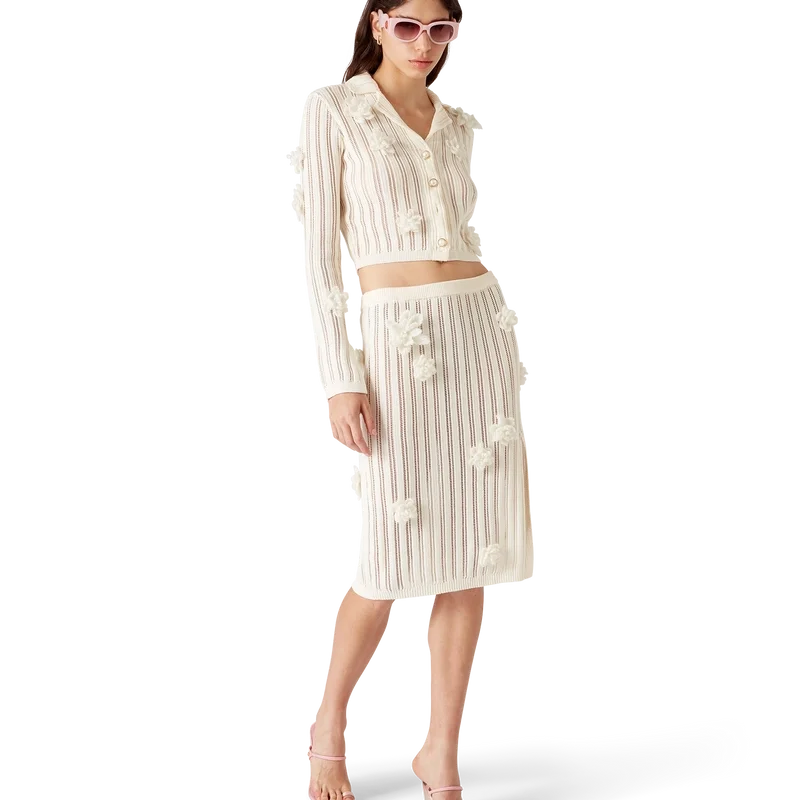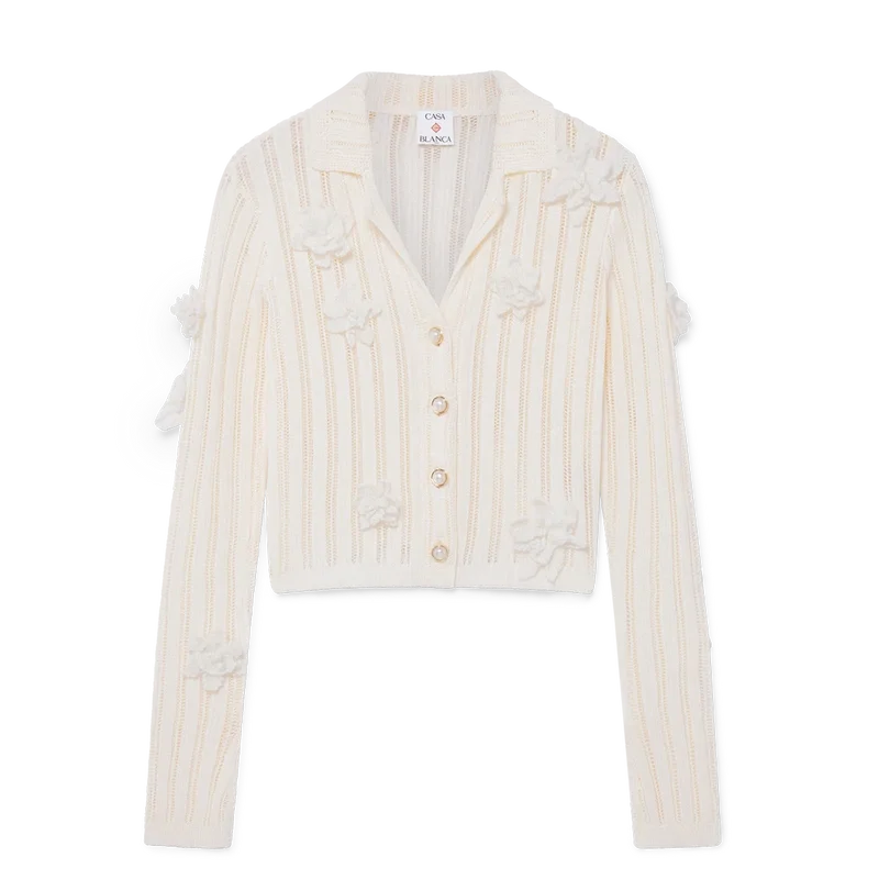 Cămașa din tricot cu dantelă florală este un model cu mâneci lungi, confecționat din țesătură de bumbac tricotată cu dantelă. Prezintă mâneci clopot cu detaliu decupat, guler, închidere cu nasturi, nasturi cu margini aurii și perle, caracteristice mărcii, și aplicații cu motive florale.
