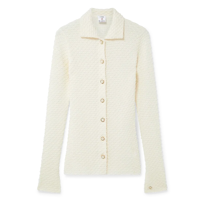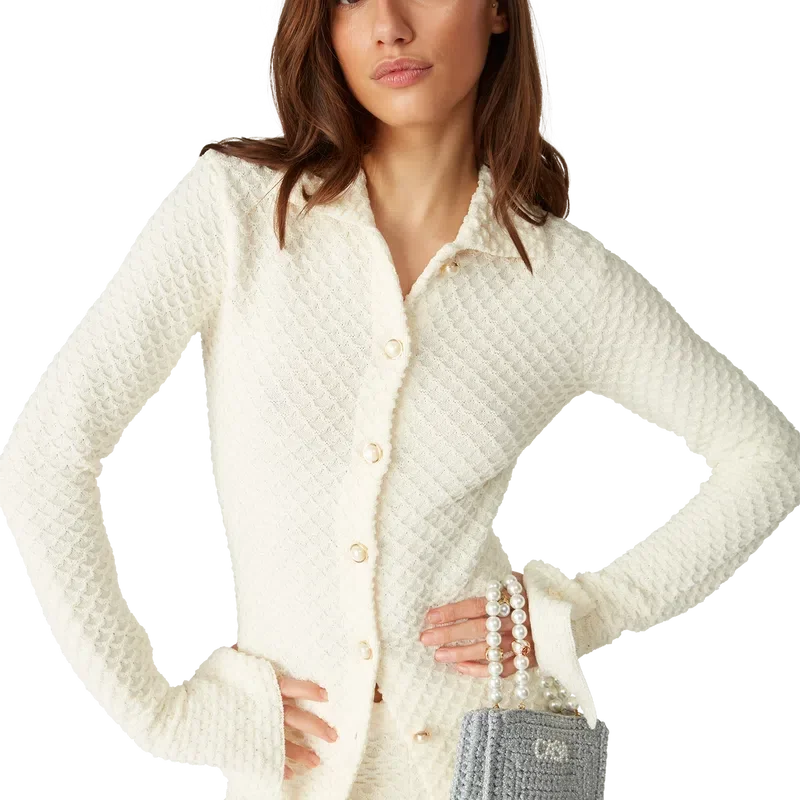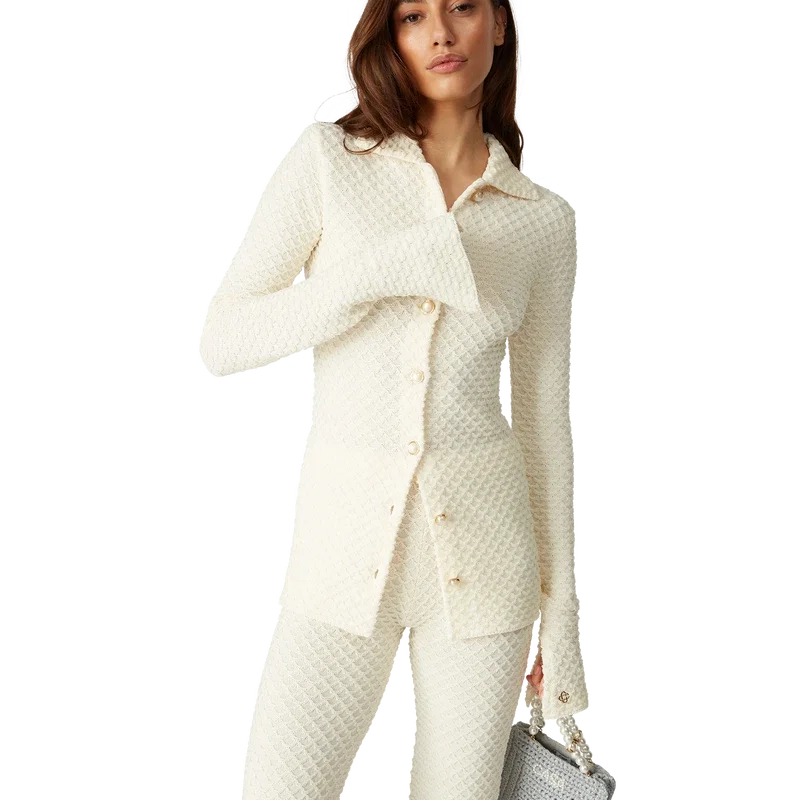 Cămașa tricotată texturată este un model cu mâneci lungi, confecționat din țesătură din amestec de bumbac. Prezintă guler, mâneci evazate cu fante, închidere cu nasturi în față, nasturi cu margine aurie și perle, precum și un nit Cc interconectat placat cu aur.