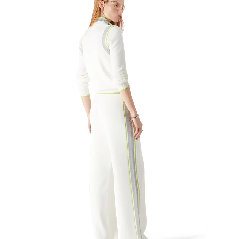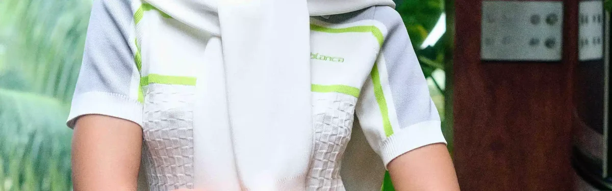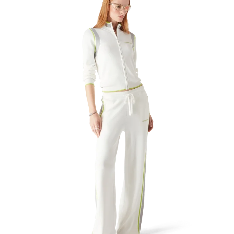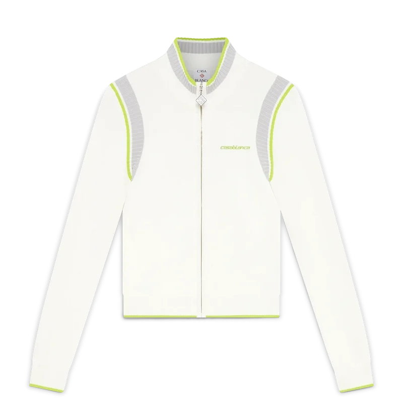 Jacheta de tenis cu guler și mâneci lungi are un design inspirat din îmbrăcămintea sportivă, cu logo-ul Casablanca în verde. Este prevăzută cu închidere cu fermoar cu tirantul în formă de diamant caracteristic casei, guler înalt tricotat, manșete, tiv și detalii la subraț, precum și o siluetă lejeră.