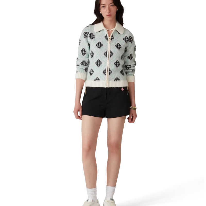 Puloverul cu fermoar și monogramă din mohair este un model cu mâneci lungi, care prezintă monograma intercalată Cc, semnătura casei, țesută în țesătură. Completat cu închidere cu fermoar, o bandă de fermoar cu logo-ul diamant, semnătura casei, și guler, manșete și tiv cu nervuri.