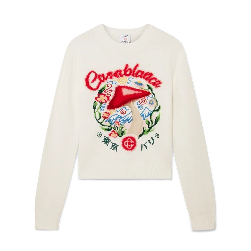 Puloverul din bumbac brodat cu ciuperci are mâneci lungi și prezintă unul dintre elementele de design emblematice ale casei – ciuperca – realizat din țesătură de bumbac. Completat cu guler rotund clasic, manșete și tiv cu nervuri.