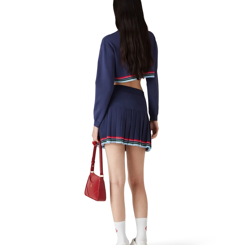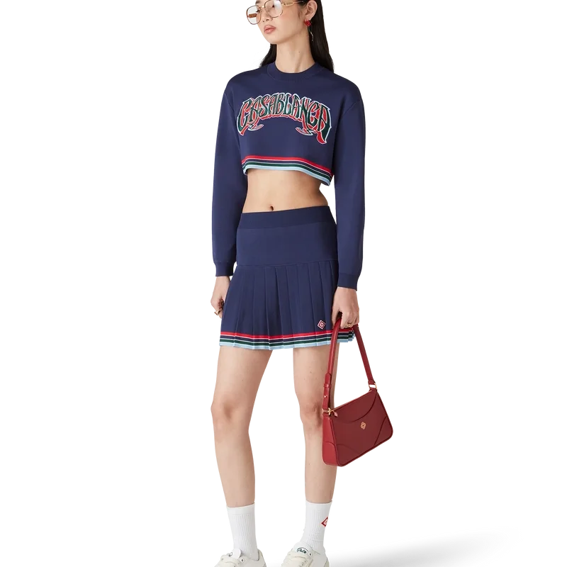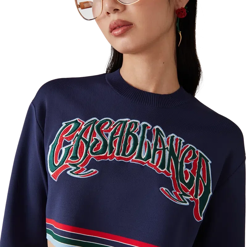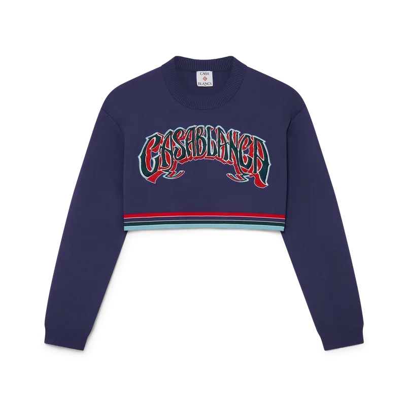 Puloverul scurt de baseball este confecționat din țesătură tricotată și prezintă o tipografie brodată, desenată manual, a logo-ului Casablanca, inspirată de fontul gotic utilizat în tatuaje. Completat cu guler și manșete din tricot, precum și cu un detaliu cu dungi orizontale roșii, albe, albastre, verzi și bleumarin pe tiv.